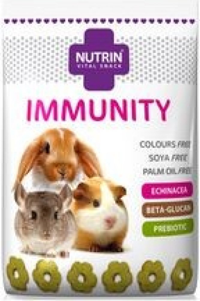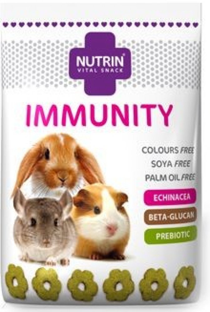 Výjimečné složení doplňkového krmiva NUTRIN Vital Snack podporuje zdraví a kondici zvířete. Zdravá křupavá odměna s blahodárnými účinky bylin a dalších obohacujících složek. Neobsahuje přidaný cukr a tím chrání zuby a napomáhá udržení celkové kondice zvířete. Zpestření běžné krmné dávky, zábavná forma krmení. Doplňkové krmivo s echinaceou, betaglukanem, prebiotiky a zvýšeným obsahem vitamínů, podporuje imunitní systém. Je prevencí před bakteriálními a virovými infekcemi. Echinacea, zdroj přírodních látek s antibiotickými účinky, navyšuje aktivitu a počet obranných buněk a povzbuzuje buňky k zesílení imunitních mechanizmů. Výsledný efekt podporuje přídavek betaglukanu, který obranné buňky stimuluje k vyšší aktivitě a organismus tak daleko lépe čelí infekcím během náročnějších období. Aby vše správně fungovalo, obsahuje krmivo vysoký obsah prebiotika různé druhy vlákniny na podpoření střevní mikroflóry a správné funkce střev. Zajistěte morčeti neomezený přístup k čerstvé vodě a senu. Doporučená denní dávka 10-20% celkového příjmu potravy. Skladování Skladujte v chladu, suchu a temnu. Složení obiloviny, vedlejší výrobky rostlinného původu (z toho echinacea min 0,3%), kvasnice, minerální látky, bílkovinné extrakty rostlinného původu, oleje a tuky, betaglukan 300 mg Analytické složky hrubý protein 14%, hrubá vláknina 13%, hrubé oleje a tuky 3%, obsah anorganických látek 7% Nutriční doplňkové látky/kg vitamíny: vit A 30.000 m.j., vit D3 2700 m.j., vit E (alfatokoferol) 200 mg; aminokyseliny: L-lysin 5 g, DL-methionin 2 g; zootechnické doplňkové látky: FOS (inulin) 4 g Velikost balení 100 g