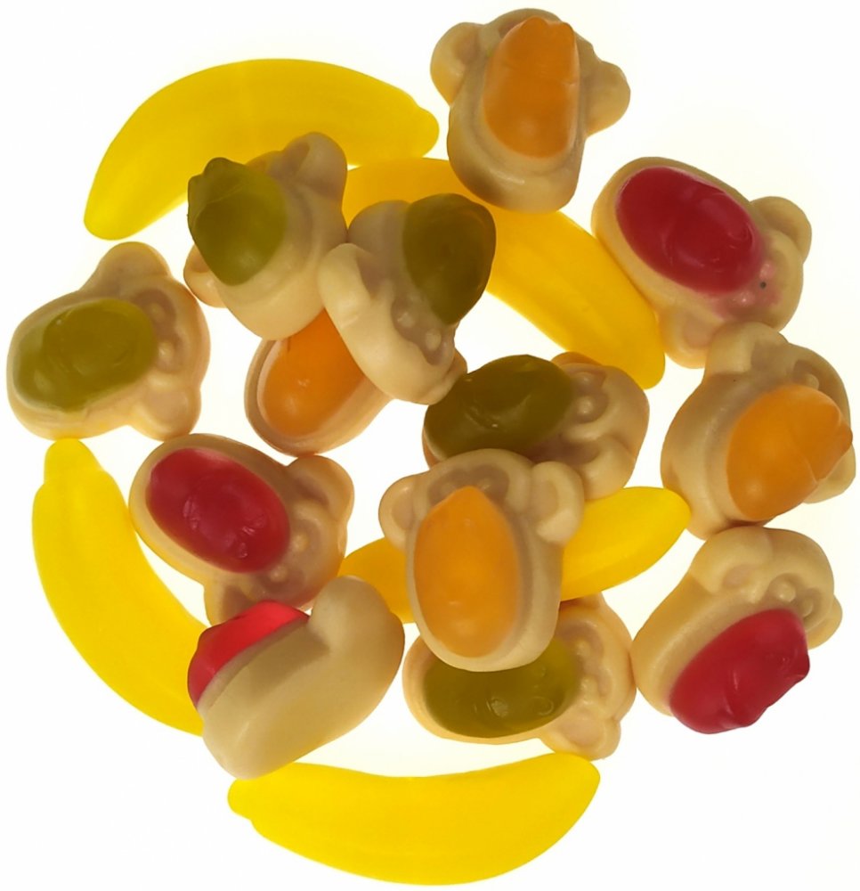 Složení: glukózový sirup, cukr, voda, želatina, regulátor kyselosti -kyselina citronová, zvlhčující látka- sorbitol, koncentrát z hroznového vína, ananasu, pomeranče, mandarinky, guavy, meruňky, manga, marakuji, banánu, jablka, papáji a limetky 1,2%. Barviva- kurkumin, chlorofyly a chlorofyliny, paprikový extrakt, bezinkový koncentrát, karamel. Aromata, leštící směs - kokosový a palmojádrový olej, leštící látka- karnaubský vosk, zahušťovadlo- pektin. Skladování: Uchovejte v suchu, chraňte před teplem. Nevystavujte přímému slunečnímu svitu. Země původu: Česká republika Základem "gumových" bonbónů je želatina. To je zdrojem kolagenu, který je základní stavební jednotkou pro vznik pojivové tkáně zejména pohybového aparátu - chrupavek, kostí, ale i vlasů, nehtů, pokožky, Zjednodušeně řečeno jakýsi "elixír věčného mládí." Avšak pozor! Obsah kolagenu není tak vysoký, aby měly želatinové bonbony na lidský organismus zázračný účinek.