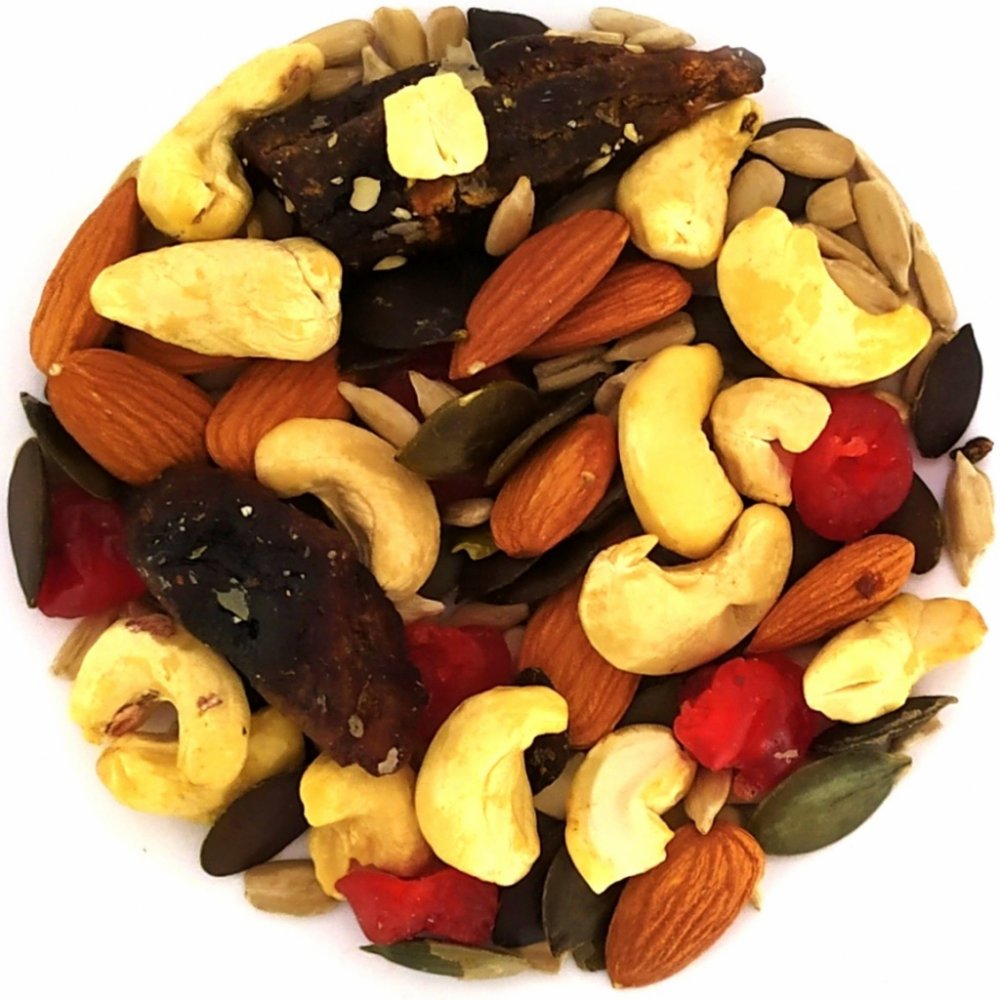 Složení: 20 % kešu, 20 % mandle Nonpareil, 20 % banánové kousky, 20 % dýňové semínko premium, 10 % slunečnicová semínka, 10% třešně proslazované Alergeny: Skořápkové plody. Může obsahovat stopy oxidu siřičitého, arašídů, sezamu, sóji a výrobky z nich. Upozornění: Výrobek obsahuje skořápky/pecky. Z tohoto důvodu není vhodný pro děti do 3 let. Skladování: Skladujte v suchu při teplotě do 20°C. Po ot...