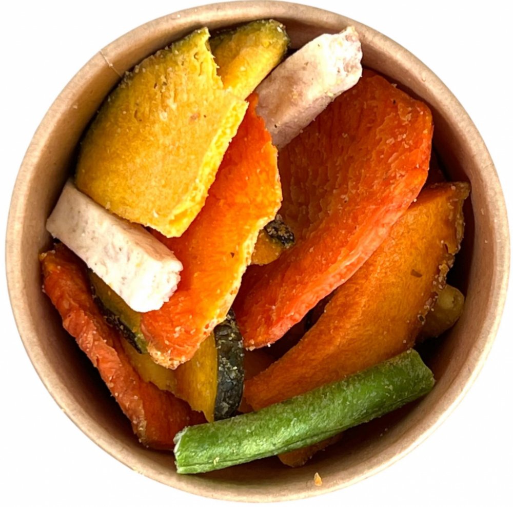 Vakuově smažené zeleninové chipsy - Sladké brambory, dýně, taro, mrkev, zelené fazolky (fazole máslová), kokosový olej, dextrin, mořská sůl