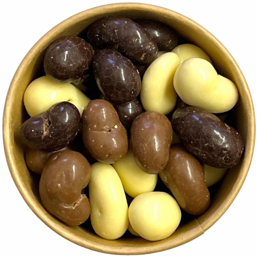 Složení: Kešu v bílé čokoládě (Holandko) - bílá čokoláda 72% (cukr, kakaové máslo, sušené plnotučné MLÉKO, LAKTÓZA, sušené odstředěné MLÉKO, SOJOVÝ lecitin, přírodní vanilkové aroma), KEŠU jádra 28%, leštidlo: arabská guma. Kešu v hořké čokoládě (Holandsko) - hořká čokoláda 72% (cukr, kakaová hmota, kakaové máslo, SOJOVÝ lecitin, přírodní vanilkové aroma), KEŠU jádra 28%, leštidlo: arabská guma. Kešu v mléčné čokoládě (Holandsko) - KEŠU ořechy 25%, mléčná čokoláda 75% (cukr, kakaové máslo, sušené plnotučné MLÉKO, kakaová hmota, sušená SYROVÁTKA (MLÉKO), LAKTÓZA, SOJOVÝ lecitin, přírodní vanilkové aroma), leštidlo: arabská guma