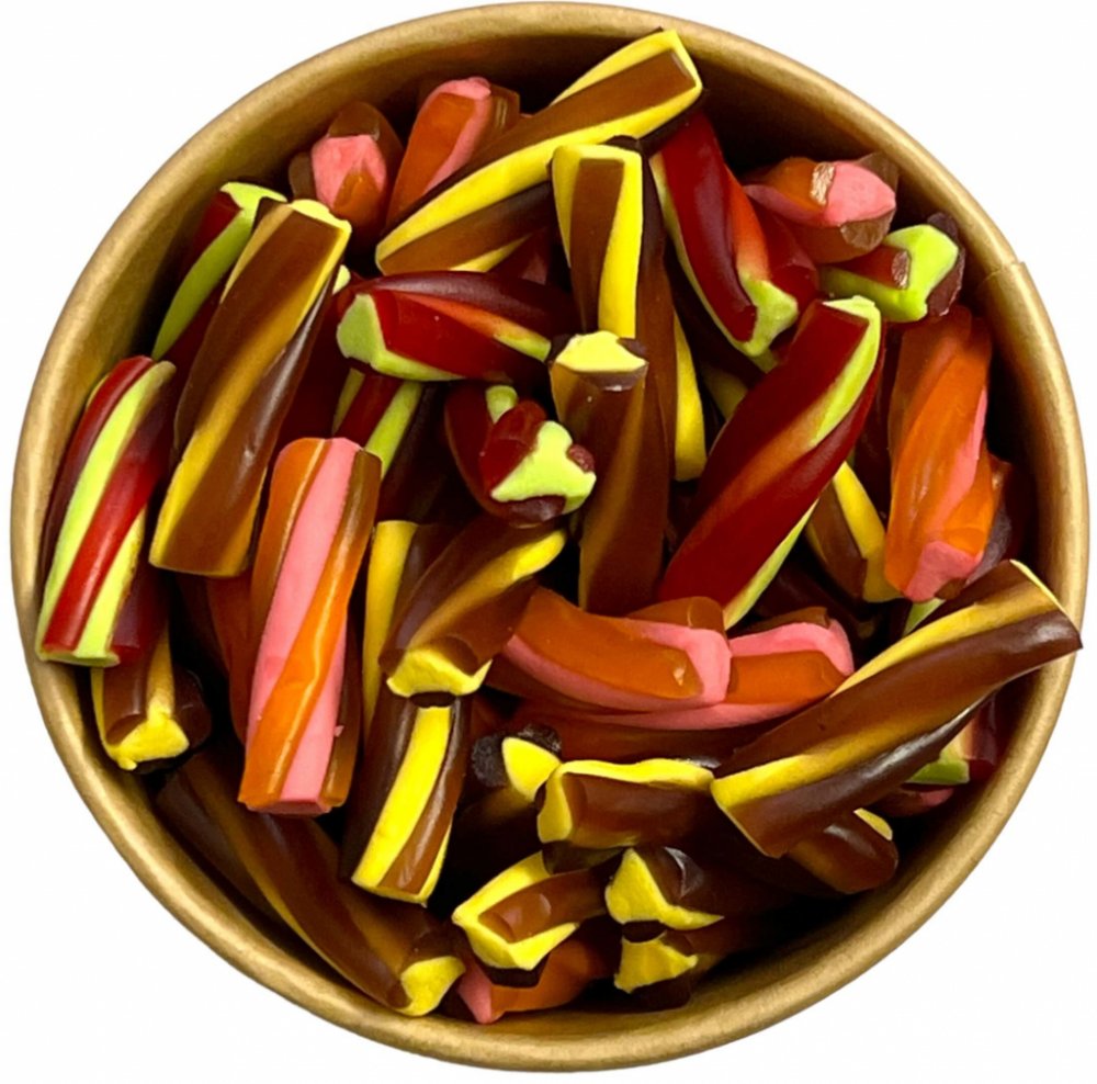 - Složení: cukr, glukózový sirup, pšeničná mouka, rostlinný tuk (bambucký olej, kokosový olej), želatina, glycerol (E422), aroma, sůl, kyselina citronová (E330), barviva (E120, E131, E160a), rostlinný olej (řepkový olej, slunečnicový olej), leštící činidlo (E90, E903).