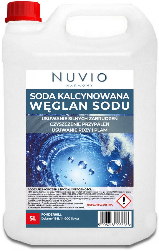 Soda 5 l - uhličitan sodný 99% | NUVIOVšestranný, účinný a ekologický prostředek pro průmysl a domácnost Použití: Průmysl:Sklářství: bod tání písku - nezbytný při výrobě sklaChemie: Surovina pro výrobu NaOH, čisticích prostředků, fosfátů, sloučenin sodíkuPrací prostředky: Přísada do pracích prášků - změkčuje vodu, zvyšuje účinek pracích prostředkůPapír: Pomáhá odstraňovat lignin z dřevní hmotyHutnictví: Čistí rudy a odstraňuje nečistoty vmetalurgických procesechPotraviny: (při vhodné čistotě) jako regulátor kyselostiTextilní průmysl: odstraňuje mastnotu a usnadňuje barvení tkanin Úprava vody:Účinně odstraňuje vápenaté a hořečnaté ionty - změkčuje vodu Použití v domácnosti:Pro čištění koupelen, kuchyní, nádobíOdvápňuje a odstraňuje usazeniny z tvrdé vodyPřísada do ekologických čisticích prostředků pro kutily Specifikace výrobku: Vhodný pro čištění vodních kamenů a vodních usazenin:Název: uhličitan sodný (uhličitan sodný, Na₂CO₃)Čistota: 99 %Objem: 5 lForma: prášek Výhody:Univerzální použití - průmysl, domácnost, zahradnictvíEfektivní balení - až 5 litrů práškuŠetrný kživotnímu prostředí - bezpečná alternativa k agresivním chemikáliím