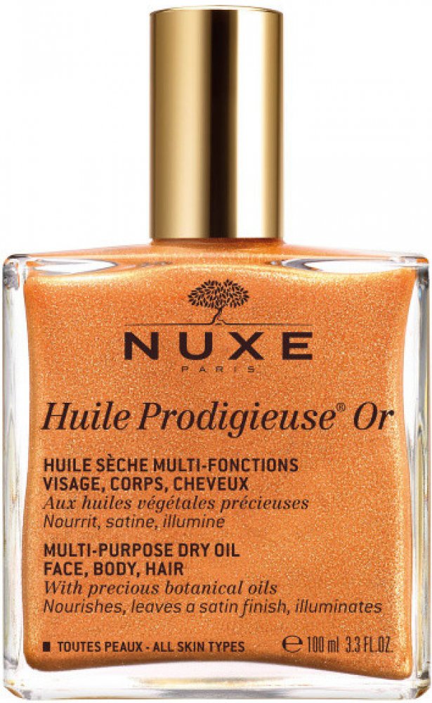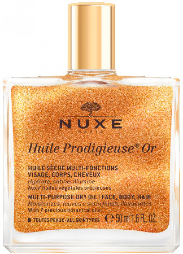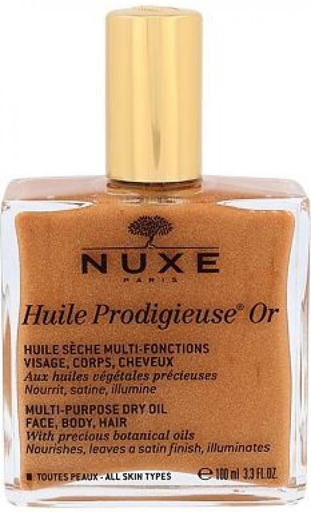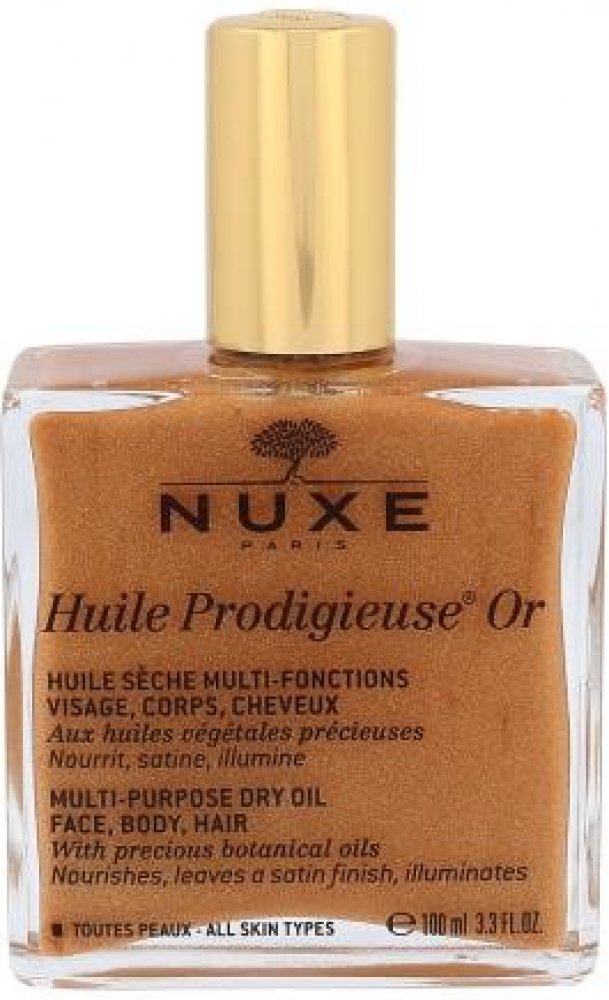 NUXE Huile Prodigieuse Or. Třpytivý suchý olej NUXE Huile Prodigieuse Or obsahuje 7 vzácných olejů a zlaté perličky, které jsou připravené hýčkat vaši pleť, vlasy i celé tělo nejen tím, že je perfektně vyživí a zhydratují, ale navíc jim dodají krásnou vůni a zlatavý třpyt. Jaké jsou benefity oleje NUXE Huile Prodigieuse Or? * důkladně vyživuje a hydratuje pokožku i vlasy, * rychle se vstřebává a n