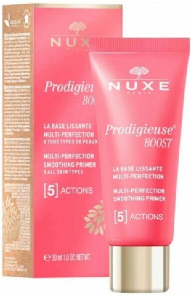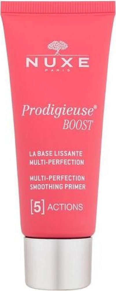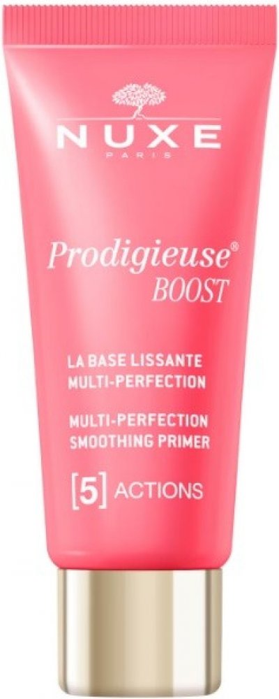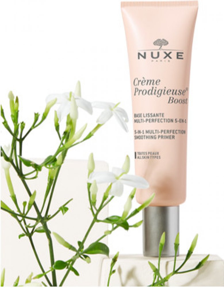 Crème Prodigieuse Base Lissante Multi-Perfection 5-en-1 od NuxeCrème Prodigieuse Boost od Nuxe je multiperfekční a vyhlazující podkladová báze 5 v 1. Jako účinná rozmazávací péče proti stárnutí s nahým efektem je vhodná pro všechny typy pleti a zajišťuje rovnoměrný vzhled. Tato speciální péče o obličej obsahuje antioxidační komplex z květů jasmínu a zdokonalující silikonové pudry přírodního původu, které působí proti viditelným známkám stárnutí pleti. Podráždění pleti způsobené například intenzivním životním stylem a nedostatkem spánku, stejně jako známky únavy, mdlá pleť nebo skvrny jsou tak během krátké doby skryty. První známky stárnutí pleti se při každodenním používání zmenšují a pleť získává dokonalý vzhled. Multi-perfektor s přírodními složkami Netónovaná rozmazaná textura báze Base Lissante Multi-Perfection 5-en-1 vytváří zcela přirozený nahý efekt, kterého lze dosáhnout i bez make-upu. Nekomedogenní péče o obličej zachovává přirozenou rovnováhu pleti, jak bylo prokázáno v klinických testech. Vyhlazující bázi aplikujte ráno po obvyklém denním hydratačním krému a jemnými pohyby ji rozetřete zevnitř směrem ven na oblasti obličeje, které vyžadují speciální ošetření. Vyhlazující podkladová báze 5 v 1 od značky Nuxe je ideální jako podkladová báze nebo k úpravě make-upu během dne.