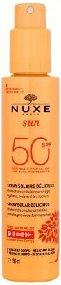 NUXE Sun Delicious Spray. Opalovací mléko ve spreji NUXE Sun Delicious Spray SPF30 obsahuje exkluzivní patentovaný filtrační komplex UVA/UVB ochrany. Díky tomu poskytuje účinnou ochranu před negativním vlivem slunečních paprsků a předčasným stárnutím pokožky. Má příjemnou ultralehkou texturu a elegantní, květinově-ovocná vůni. NUXE Sun Delicious Spray vaši pokožku ochrání i provoní! * poskytuje po