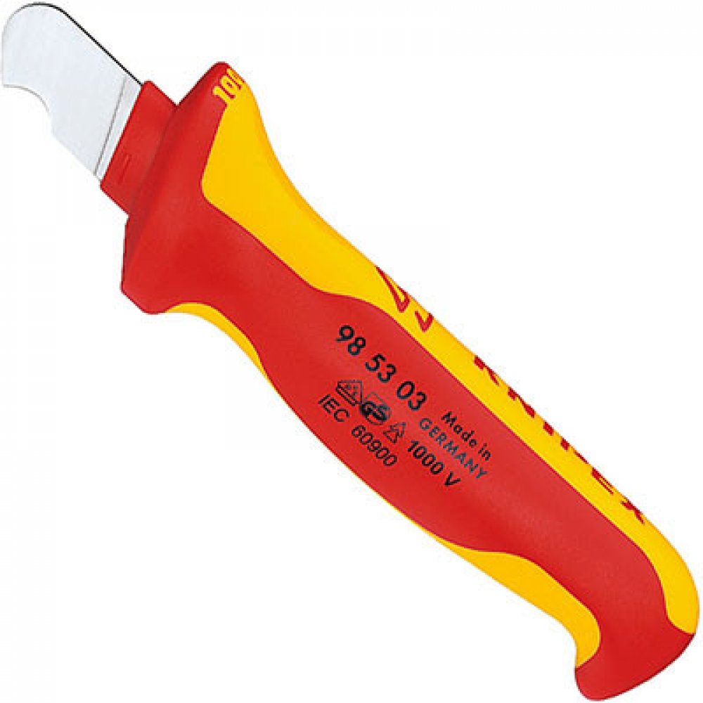 Nůž na odstranění izolací 155 mm KNIPEX je vhodný na kabely kruhového průřezu. Díky tvaru rukojeti se dobře drží, díky protiskluzové měkké vrstvě je bezpečný. Také díky prohloubení pro palec a "prstovému háčku" na konci rukojeti má dobrý přenos síly při tahu. Má stabilní a pevnou hákovou čepel s rovným břitem a také držadlo s ochranou proti sklouznutí. Čepel je vyrobena ze speciální nástrojové oceli kalené v oleji. Zkoušený VDE podle DIN EN/IEC 60900 : 2004.