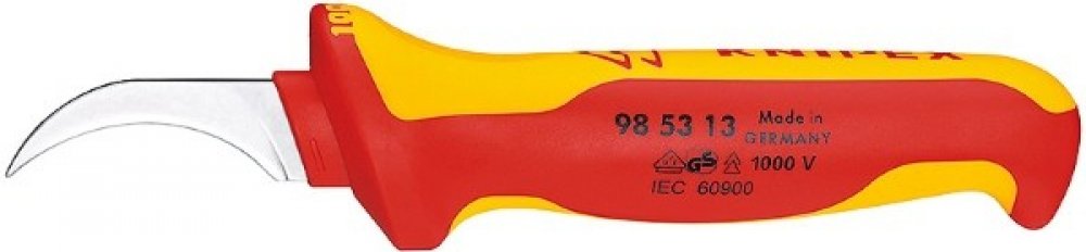 Nůž na odstranění izolací 180 mm KNIPEX je vhodný na kabely kruhového průřezu. Díky tvaru rukojeti se dobře drží a kvůli protiskluzové měkké vrstvě je bezpečný. Také díky prohloubení pro palec a "prstovému háčku" na konci rukojeti má dobrý přenos síly při tahu. Má stabilní a pevnou hákovou čepel s rovným břitem a také držadlo s ochranou proti sklouznutí. Čepel je vyrobena ze speciální nástrojové oceli kalené v oleji. Zkoušený VDE podle DIN EN/IEC 60900 : 2004.