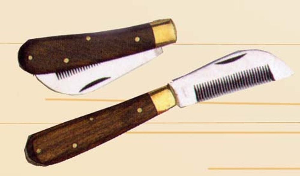 Nůž na seřezávání hřívy vyrobený z kvalitní oceli s rukojetí z pravého dřeva.