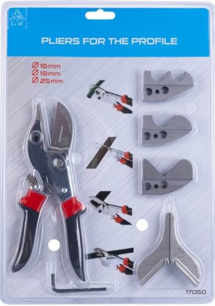 Kleště na PVC lišty a trubky, kleště s kaleným ostřím a výměnnými čelistmi, pro střihy PVC lišt s nastavitelnými úhly a PVC trubky, ergonomické rukojeti, blistr.