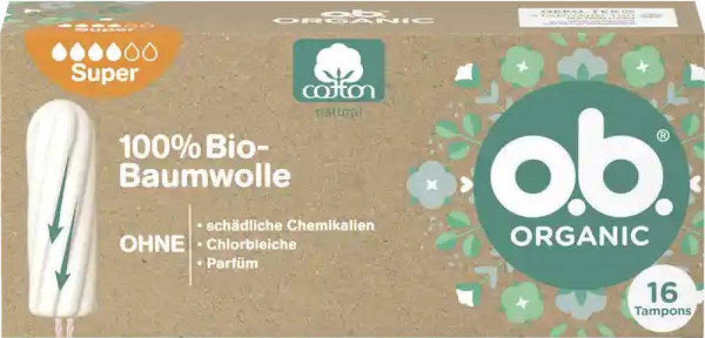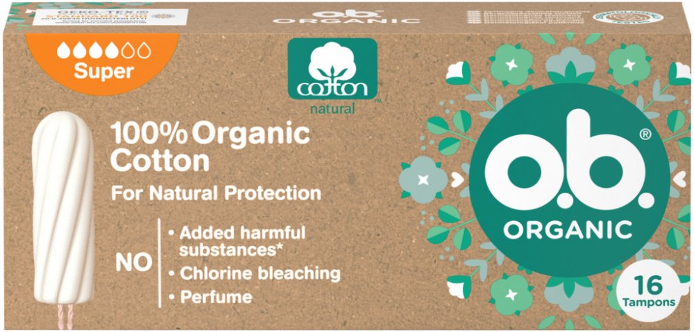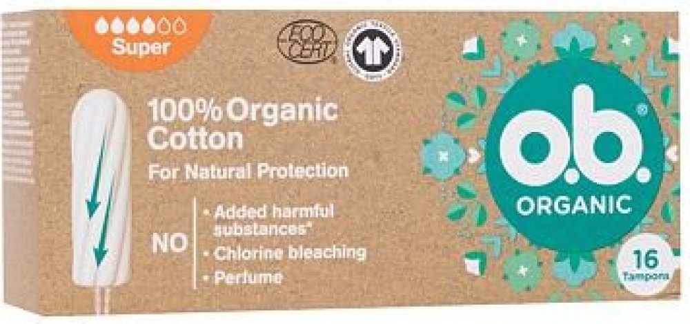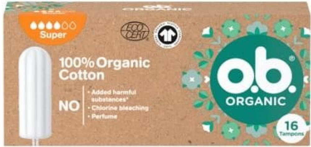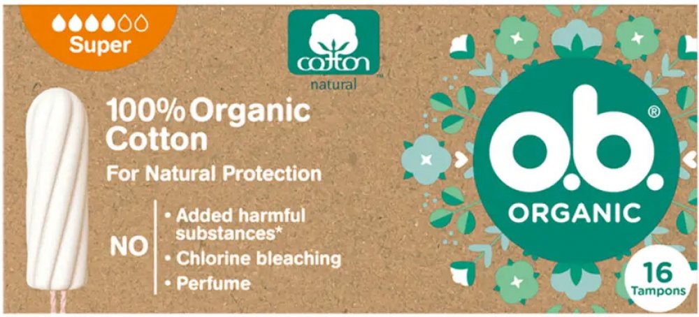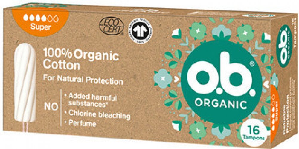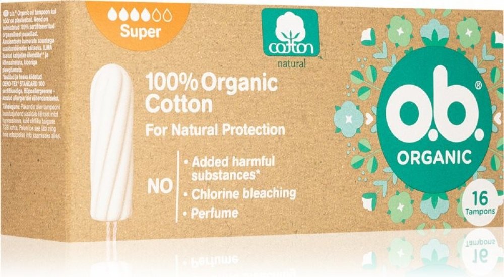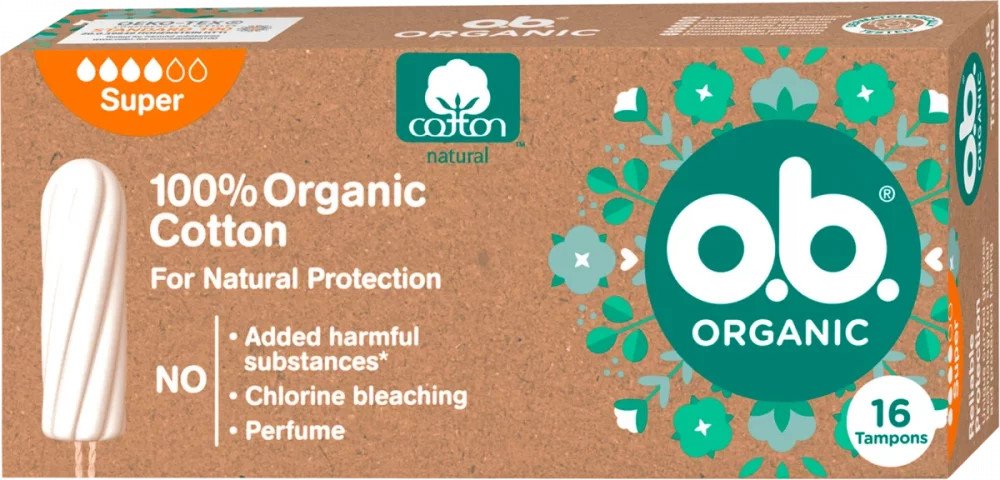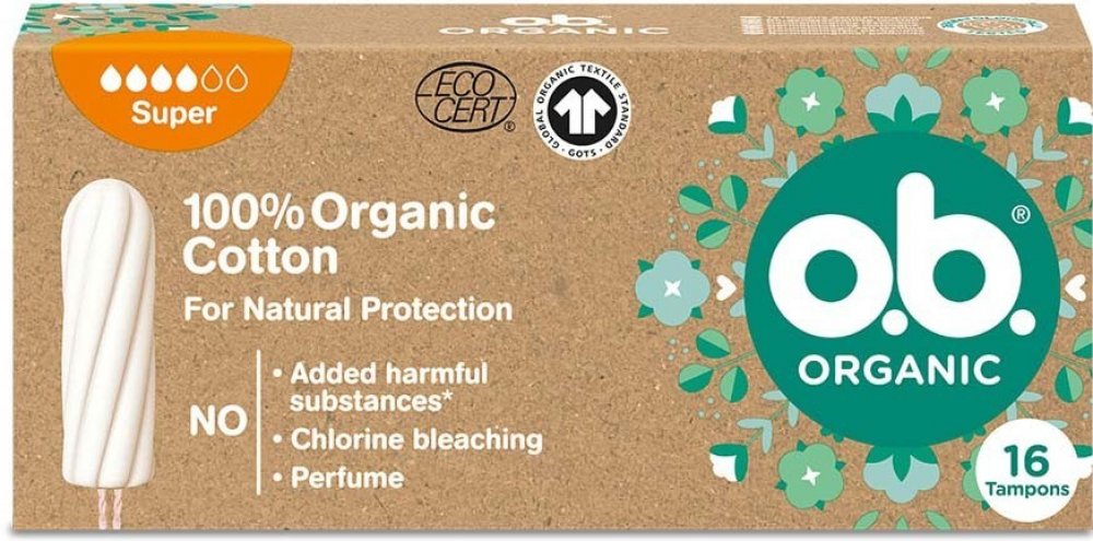 Tampony o.b.® Organic Super ze 100% certifikované organické bavlny s unikátními stočenými drážkami pro spolehlivou ochranu. Všechny tampony o.b.® jsou BEZ přidaných chemických škodlivin, nebělené chlorem, neparfemované a gynekologicky testované. Krabička je min. ze 75 % vyrobena z recyklovaného papíru, je plně recyklovatelná a potištěna inkoustem na rostlinné bázi. o.b.® Organic jsou šetrné nejen k vašemu tělu, ale také k životnímu prostředí.