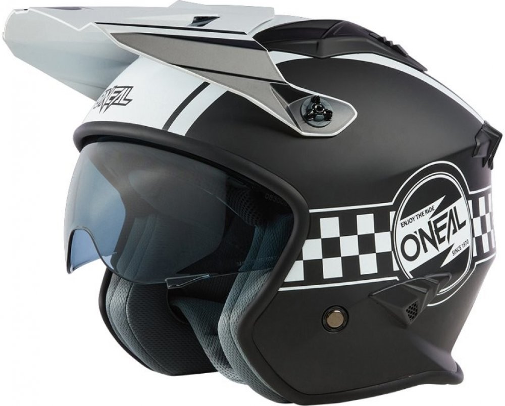 Přilba pro trial a skútr. Lehká konstrukce z ABS. Zapínání na přezku. Větrací otvory. Vyjímatelné. pratelné, pot absorbující polstrování. Výškově nastavitelný kšilt. Splňuje normu ECE 22.05.