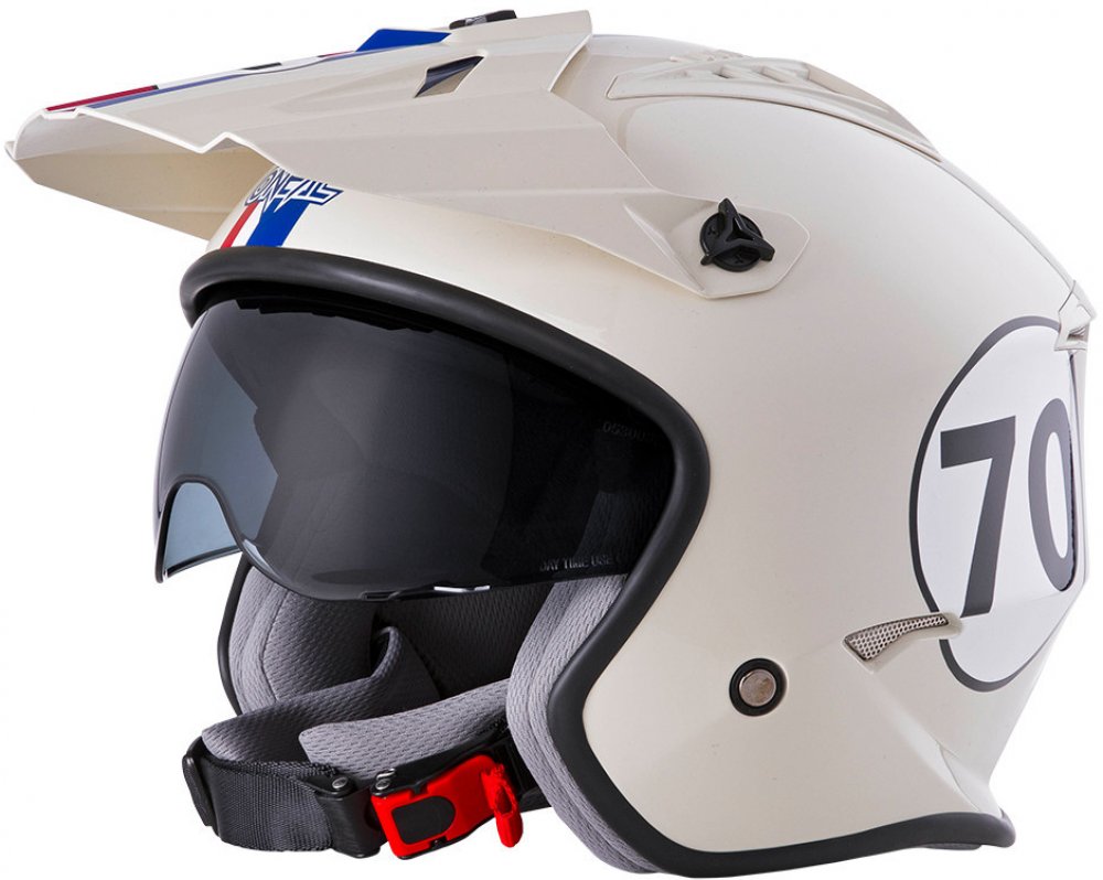 Přilba pro trial a skútr. Lehká konstrukce z ABS. Zapínání na přezku. Větrací otvory. Vyjímatelné. pratelné, pot absorbující polstrování. Výškově nastavitelný kšilt. Splňuje normu ECE 22.05.