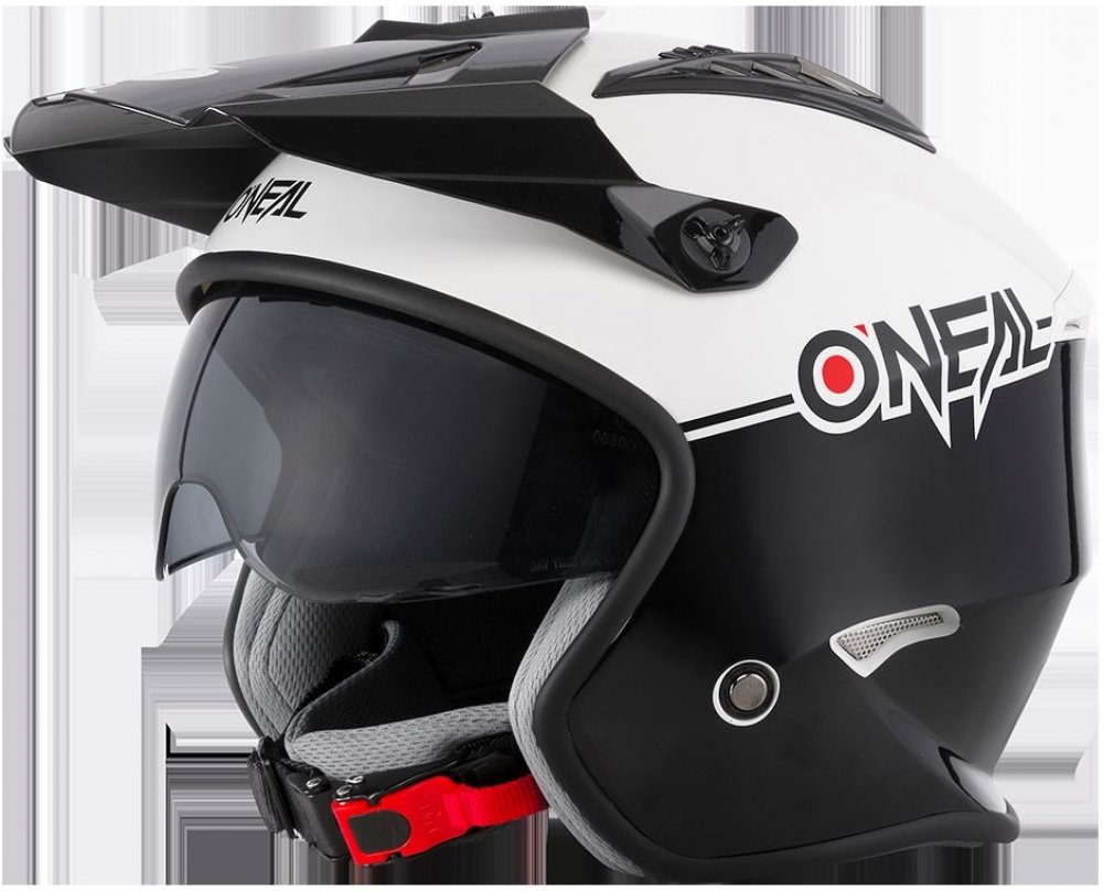 Přilba pro trial a skútr. Lehká konstrukce z ABS. Zapínání na přezku. Větrací otvory. Vyjímatelné. pratelné, pot absorbující polstrování. Výškově nastavitelný kšilt. Splňuje normu ECE 22.05.