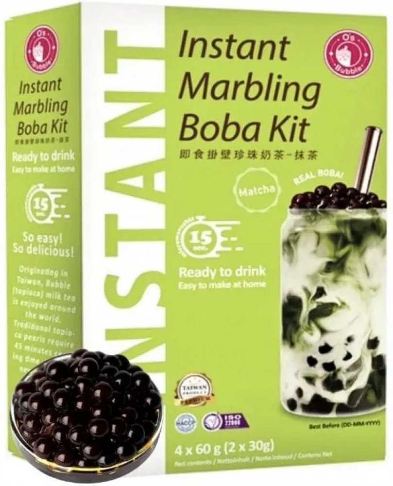 Instantní Marble Bubble Tea s příchutí Matcha je ideální volbou pro milovníky asijských nápojů. Nabízí jedinečnou kombinaci zdravých benefitů matcha čaje s zábavnou texturou bubble tea. Snadná příprava z vás udělá experta na bubble tea v pohodlí vašeho domova. Návod k použitíMramorovacím sirupem ozdobte krouživými pohyby vnitřek skleničky. Odstřihněte růžek sáčku Bobba a vložte na 15 vteřin do mikrovlnně trouby. Nasypte Bobba do skleničky. Přidejte 80g ledových kostek a zalijte 150ml mléka. Promíchejte a můžete servírovat s brčkem.SloženíBoba: voda, tapoiokový škrob, cukr, modifikovaný tapiokový škrob, barvivo E150d, hnědý cukr, příchuť, stabilizátor E466, E575, želírovací látka E415, kyseliny E270, E296, Sirup: maltóza, cukr, voda, Matcha prášek 1,47%, prášek z čaje Oolong, příchuť, konzervant E202, zahušťovadla E466, E415Alergieneobsahuje
