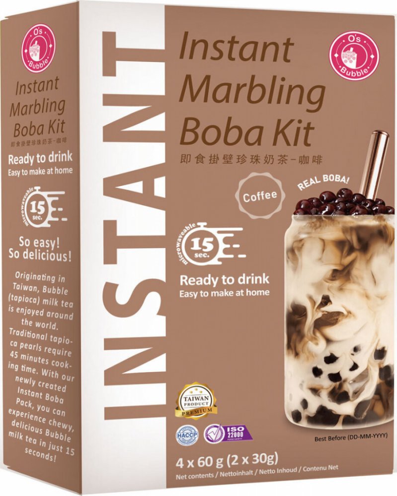 O's Bubble 240g instantní bublinkový čaj s příchutí kávy (4x 60g) S tapiokovými perlami a brčkem Úžasně lahodnýTchajwanská sada instantních nápojů na bázi slazené kávy s tapiokovými perlami a papírovým brčkem.Příprava: 1. Nalijte 30 g sirupu do šálku nebo sklenice. 2. Rozřízněte balíček tapiokových perel, ohřejte v mikrovlnné troubě po dobu 15 sekund a přidejte obsah. 3. Přidejte 150 ml mléka a 80...