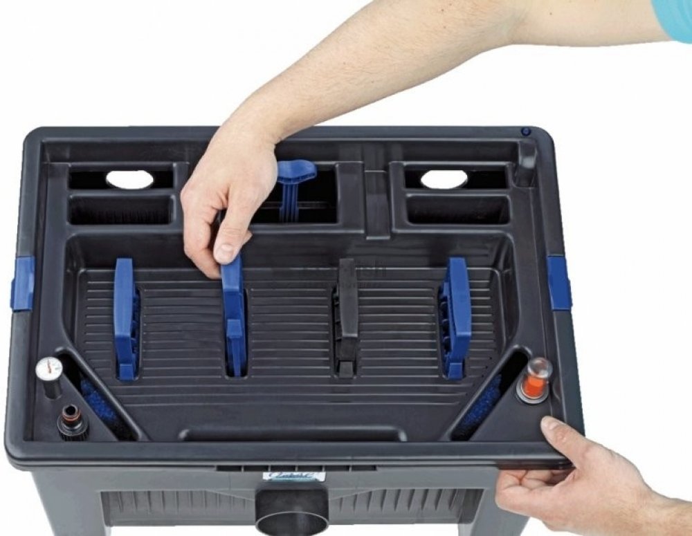 Speciální vedení vody během filtrace pomáhá obohacovat vodu kyslíkem, čímž podporuje přirozený ekosystém jezírka. Filtr je vybaven čisticími rukověťmi, které usnadňují údržbu filtračních houbiček, a odkalovacím otvorem pro snadné odstranění hrubých nečistot.