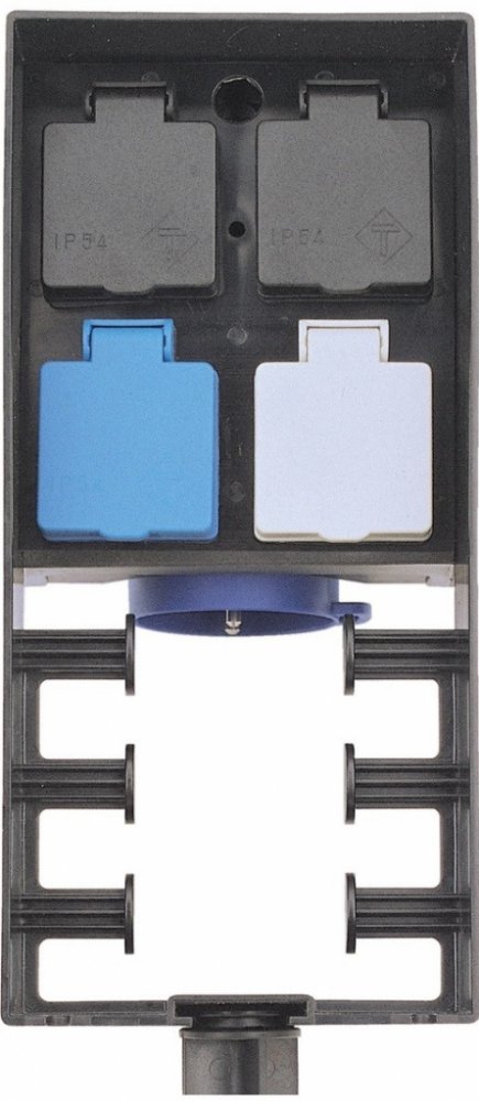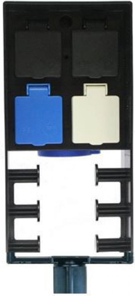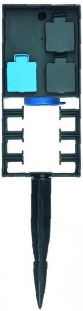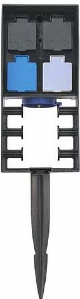 Elekro 4-zásuvka, v exteriérovém provedení, s dálkovým ovládáním a s vlastním krytem proti vodě a slunci. Dodáváno s vlastním trnem pro upevnění a zakotvení do země. Stavebnicový systém nabízí možnosti připojení splňující veškeré nároky.