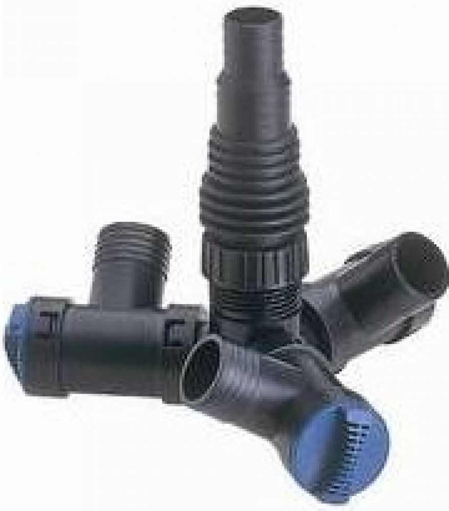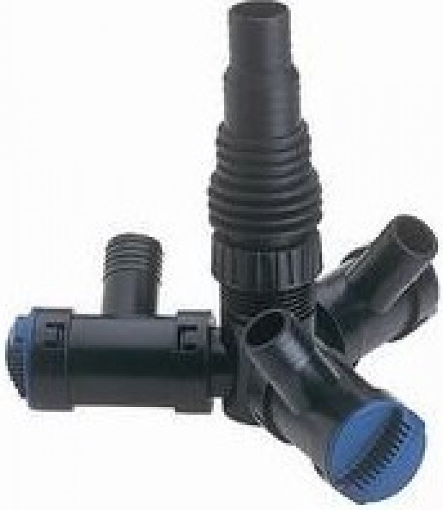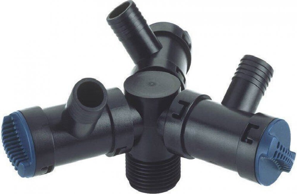 Kompaktní, regulovatelný rozváděč vody OASE Multi WD 1 "Je vybaven dvěma vstupy ¾ " a 1 "stejně jako třemi výstupy, každý 1".S uzavíracím víčkem obsaženým v rozsahu dodávky může být rozváděč vody v případě potřeby přepnut na funkci dvojitého rozváděče.