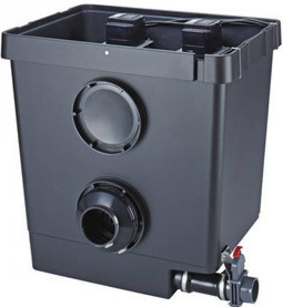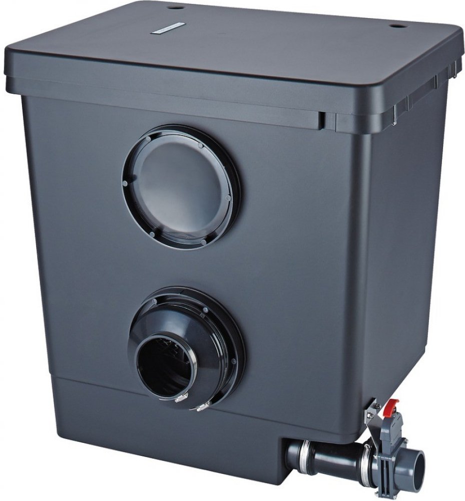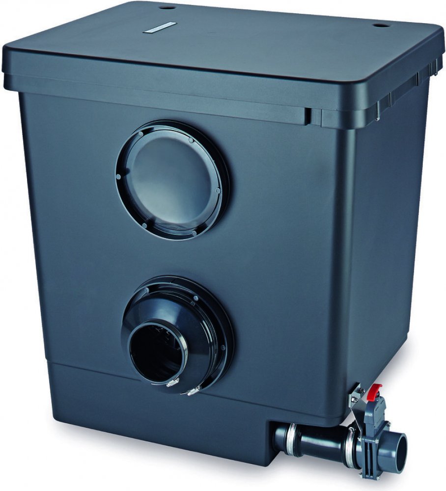 Profesionální kompaktní čerpadlová komora pro bubnový filtr jako levná alternativa pro menší rybníky, zejména koi rybníky. Vysoký separační výkon v principu napájení čerpadlem i gravitací.