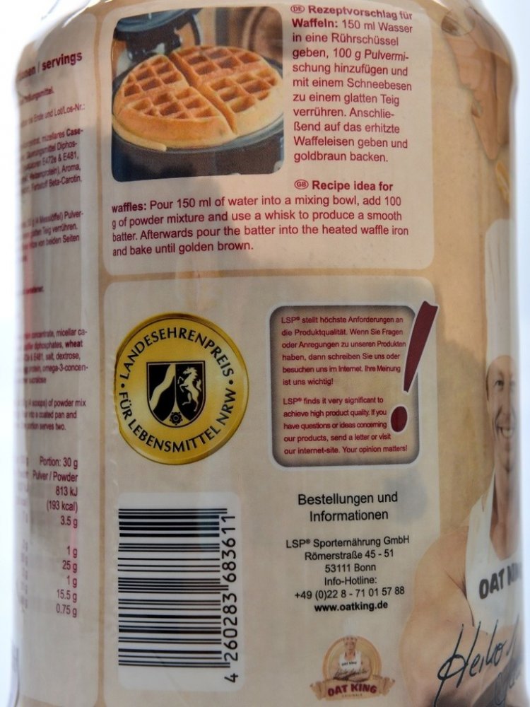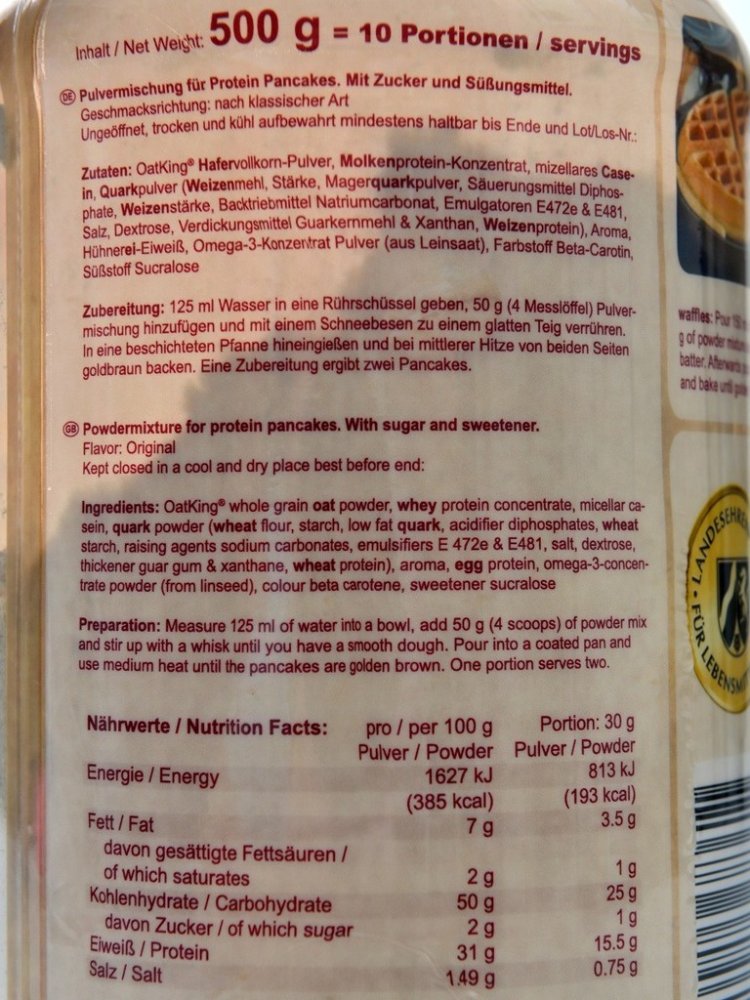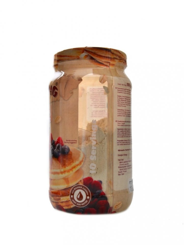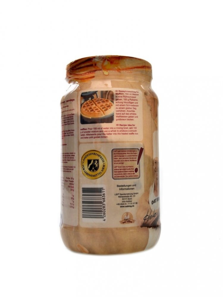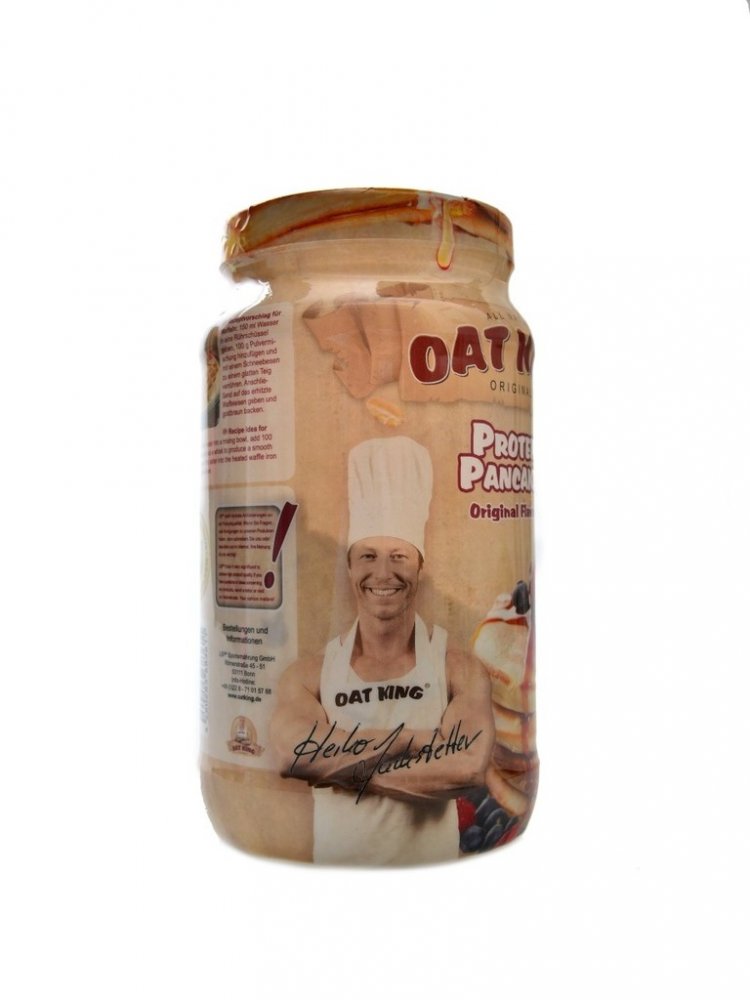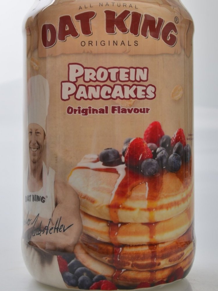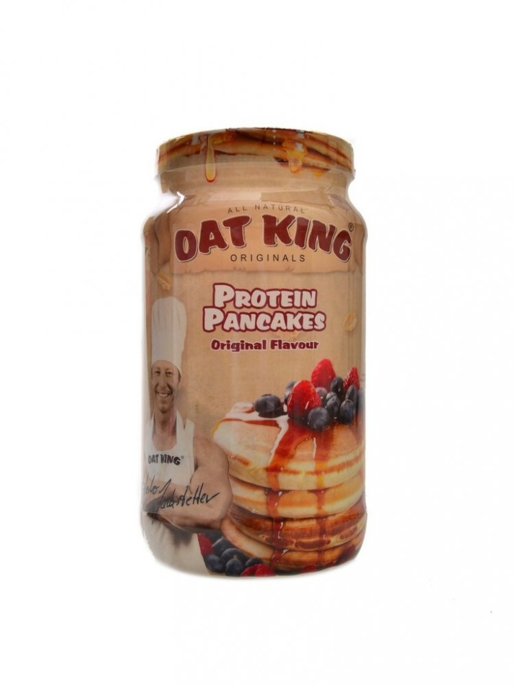 Oat King protein pancakes je směs složená ze syrovátkového bílkovinného koncentrátu a polysacharidů z ovsa. Byla speciálně vyvinuta pro dodání kvalitních proteinů kombinovaných se sacharidy s vysokým obsahem vlákniny. Je chutná, jednoduchá na přípravu a snadno mísitelná. Bílkoviny přispívají k růstu svalové hmoty, k udržení svalové hmoty a normálního stavu kostí. Produkt obsahuje vápník, který přispívá k normálnímu energetickému metabolismu, činnosti svalů, funkci trávicích enzymů a je potřebný pro udržení normálního stavu kostí a zubů.