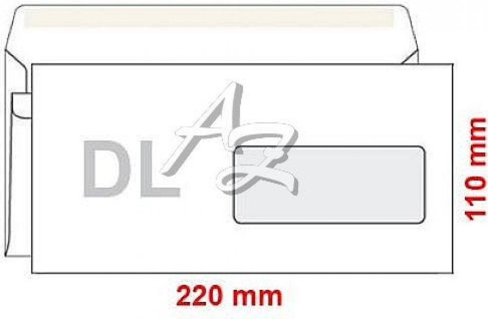 Poštovní obálka DL s okénkem, 110 x 220 mm, bílá samolepící, rovná klopa, 80 g/m2.
