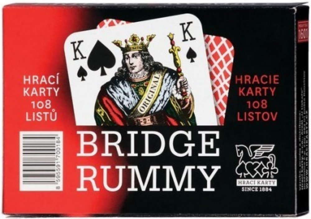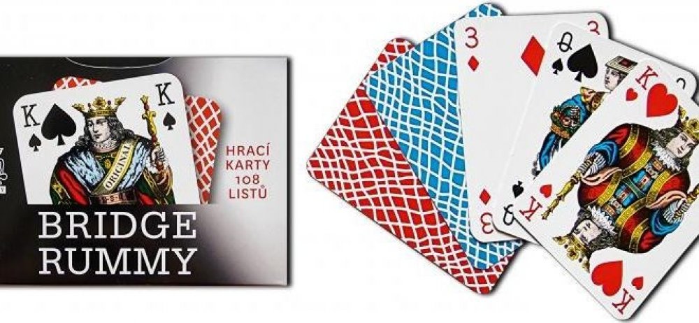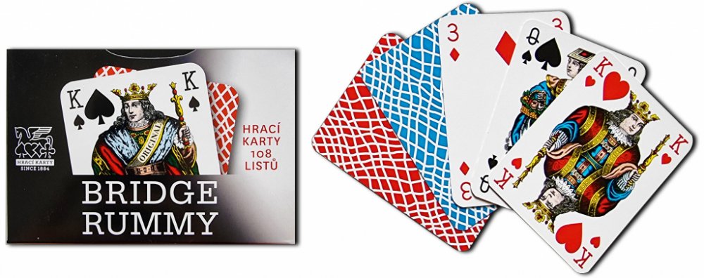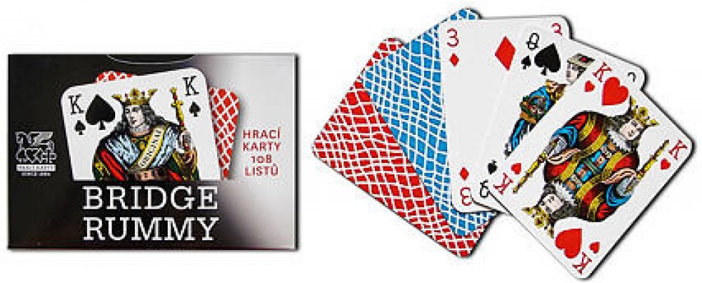 Klasické karty pro hru Bridge Rummy. Známý francouzský vzor na jiném formátu karet typu Rummy vychází z tradice použití v Čechách spolu s vlnkovým reversem v modrém a červeném provedení. Rub: vlnky. Počet listů: 108 (dvě hry 2 x 54 listů). Formát karet 67/91 mm. Papír: Casino Classic 310 g/m2. Baleno v papírové krabičce. Cena za kus.