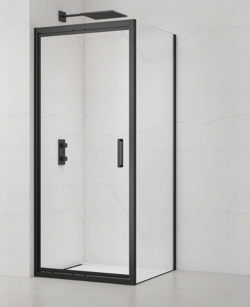 Sprchový kout včetně boční zástěny v černé barvě, výplň je z čirého skla bez dekoru. Produkt je opatřen povrchovou úpravou Easy Clean, která usnadňuje čistění a minimalizuje usazování vodního kamene. Zalamovací systém otevírání. Určení - levá i pravá orientace.