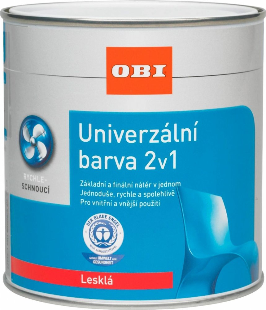 OBI Univerzální barva 2v1 Univerzální barva OBI 2v1 je rychleschnoucí akrylová barva na vodní bázi vhodná pro dekorativní a ochranné povrchové úpravy v interiéru i exteriéru. Výborně se hodí pro základní a svrchní nátěry dřeva a kovu, přetíratelné plasty (PVC) i pro renovační nátěry na všechny stabilní staré nátěry. Na podklady podléhající korozi je nutné použít antikorozní základový nátěr. OBI univerzální barva 2v1 je k dispozici v hedvábně matném a lesklém provedení. Vlastnosti a použití - Vhodná do interiéru i exteriéru jako základní i vrchní nátěr - Na staré stabilní nátěry, dřevo, materiály na bázi dřeva (např. OSB, MDF), kovy (ocel, zinek, měď, hliník) i přetíratelný plasty - Vysoce odolná vůči povětrnostním vlivům, extra odolná vůči nárazům - Teplotní odolnost do cca 80 °C - Rychleschnoucí - Nežloutne - Na vodní bázi - Snadno zpracovatelná - natírání, válečkování, stříkání - Certifikace Modrý Anděl