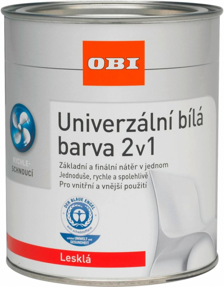 OBI Univerzální barva 2v1 Univerzální barva OBI 2v1 je rychleschnoucí akrylová barva na vodní bázi vhodná pro dekorativní a ochranné povrchové úpravy v interiéru i exteriéru. Výborně se hodí pro základní a svrchní nátěry dřeva a kovu, přetíratelné plasty (PVC) i pro renovační nátěry na všechny stabilní staré nátěry. Na podklady podléhající korozi je nutné použít antikorozní základový nátěr. OBI univerzální barva 2v1 je k dispozici v hedvábně matném a lesklém provedení. Vlastnosti a použití - Vhodná do interiéru i exteriéru jako základní i vrchní nátěr - Na staré stabilní nátěry, dřevo, materiály na bázi dřeva (např. OSB, MDF), kovy (ocel, zinek, měď, hliník) i přetíratelný plasty - Vysoce odolná vůči povětrnostním vlivům, extra odolná vůči nárazům - Teplotní odolnost do cca 80 °C - Rychleschnoucí - Nežloutne - Na vodní bázi - Snadno zpracovatelná - natírání, válečkování, stříkání - Certifikace Modrý Anděl