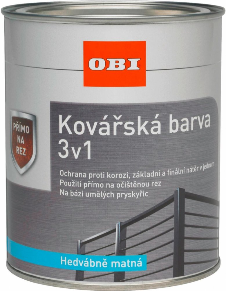 OBI Kovářská barva 3v1 je lak obsahující rozpouštědlo, bez obsahu aromátů, silně přilnavý speciální ochranný nátěr na kov na bázi syntetické pryskyřice pro dekorativní a antikorozní ochranné nátěry na kovy. Aktivní antikorozní pigmenty spolehlivě izolují rez, přičemž vysoce kvalitní pryskyřice současně tvoří ochranný svrchní povlak odolný proti povětrnostním vlivům a vlhkosti. Díky tomu je OBI Kovářská barva 3v1 nejen dobrým základním nátěrem a skvělou ochranou proti korozi, ale také dokonalým krycím nátěrem. Vhodný také pro lakování připravených a základním nátěrem opatřených podkladů z neželezných kovů a starých nosných nátěrů v interiéru i exteriéru.
