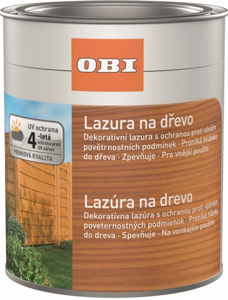 OBI Lazura na dřevoTenkovrstvá lazura OBI s obsahem rozpouštědel na dřevěné stavební díly v exteriéru (jako např. ploty, pergoly, zástěny), která se vsákne hluboko do podkladu. Zvýrazňuje kresbu dřeva, chrání ho před povětrnostními vlivy a pečuje o něj. Nevhodná na nátěr podlah. Specifikace: - Typ pojiva: alkydová pryskyřice - Aplikace: natírání štětcem - Počet vrstev: 2 - Stupeň lesku: hedvábný lesk - Hustota: cca 0,92-1,02 g/cm3, v závislosti na barvě - Teplota zpracování: min Ƴ °C pro teplotu objektu a okolí během zpracování a schnutí - Povrch suchý: po cca 4 hodinách (při რ °C a 65% relativní vlhkosti) - Přetíratelná: po cca 12 hodinách - Spotřeba: cca 80-120 ml/m2 na nátěr Doba schnutí se mění při nižších teplotách a/nebo vyšší vlhkosti. Spotřeba se může lišit v závislosti na savosti podkladu a způsobu aplikace. Přesné hodnoty spotřeby je nutné zjistit provedením zkušebního nátěru. Ředění: Připraveno k použití. Zpracovávejte neředěné. Pokyny pro zpracování Před použitím dobře promíchejte. Mezi jednotlivými vrstvami ponechejte dostatečnou dobu schnutí. Na souvislé plochy používejte pouze barvu z jedné výrobní šarže. Čištění nářadí: Nářadí ihned po použití očistěte univerzálním nitro ředidlem nebo čističem štětců.
