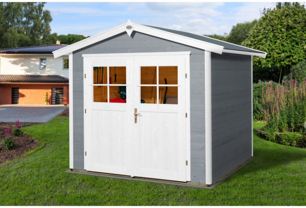 OBI Outdoor Living zahradní domek Monza B šedý/bílý je dřevěný srubový domek z 21 mm silných čistě ohoblovaných dřevěných fošen s perem a drážkou ze severského smrku opatřených ochrannou lazurou proti povětrnosti. Podlaha je nosná konstrukce z podlahových trámů ošetřených tlakovou impregnací a z 19 mm silných dřevěných prken s drážkou a perem. Výška boční stěny je 197 cm. Dvoukřídlé dveře jsou vyb...