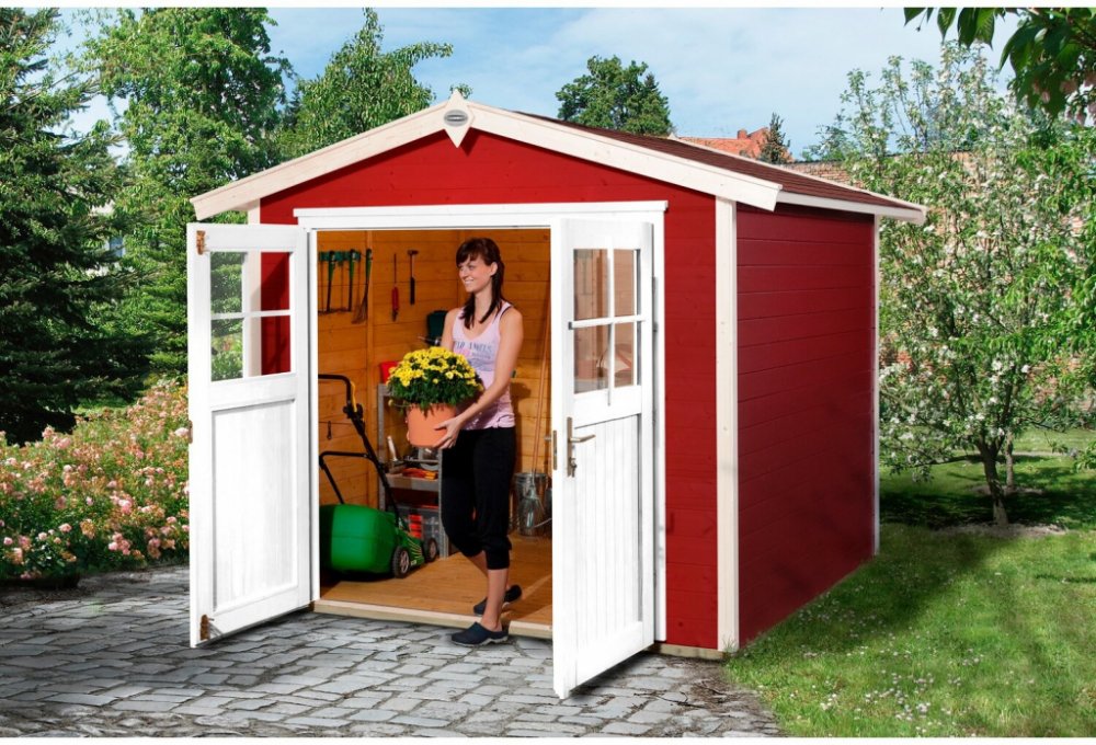 OBI Outdoor Living zahradní domek Monza B švédská červená/bílá je dřevěný srubový domek z 21 mm silných čistě ohoblovaných dřevěných fošen s perem a drážkou ze severského smrku opatřených ochrannou lazurou proti povětrnosti. Podlaha je nosná konstrukce z podlahových trámů ošetřených tlakovou impregnací a z 19 mm silných dřevěných prken s drážkou a perem. Výška boční stěny je 197 cm. Dvoukřídlé dveře jsou vybaveny cylindrickým zámkem se 3 klíči a mají světlost 165 cm x 173 cm. Sedlová střecha je vyrobena z 19 mm silných střešních prken na stabilní střešní vaznici a ze šedé bitumenové střešní krytiny pro první zakrytí. Zahradní domek má 10 cm dlouhou dveřní stříšku. Zvenku je domek opatřen červeným ochranným nátěrem proti povětrnosti, dveře, okna a lišty jsou bílé, interiér je v přírodní barvě. Rozměry: Vnitřní rozměry: cca 200 cm x 205 cm Výška boční stěny: 197 cm Objem: 8,65 m3 Světlost dveří: 165 cm x 173 cm Potřebný počet střešních šindelů: 3 balíky po 3 m2