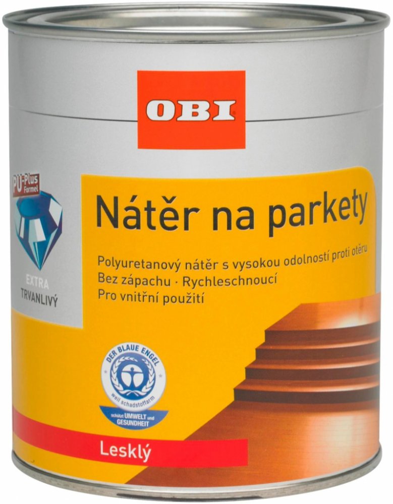 Nátěr na parkety OBI Nátěr na parkety OBI je těsnící nátěr na běžně používané dřevěné, korkové a parketové podlahy v interiéru. Je vhodný také na vnitřní dřevěné prvky, jako jsou dveře, nábytek, podlahové lišty, profilované dřevo a další. Není vhodný pro kuchyňské pracovní desky. Nátěr je vodou ředitelný, obzvláště odolný proti oděru a určený pro vnitřní použití. Vyztužený PU, odolný vůči mnoha čisticím prostředkům, odolný proti popraskání, světlo stálý, bez zápachu, rychleschnoucí a snadno aplikovatelný. S certifikací Blue Angel na odolnost vůči potu a slinám dle EN 71.3 a vhodný tak i pro dětské hračky. Vhodné nanášet 1-2 vrchní vrstvy. Aplikace štětcem, válečkem nebo stříkáním. Při + 20 °C a 65% relativní vlhkosti povrchové zaschnutí po cca 1 hodině, přetíratelný po cca 12 hodinách, plné vytvrzení po cca 24 hodinách.