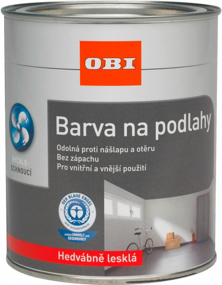 OBI Nátěr na podlahy pro běžně namáhané, savé cementové nebo betonové podlahy bez dlouhodobého zatížení vodou, pro vnitřní i venkovní použití, např. pro podlahy ve sklepech, prostorách pro party, dílnách, skladech a hobby místnostech, na schodištích, zastřešených balkonech a terasách v soukromých bytech. OBI podlahová barva je odolná vůči otěru, téměř bez zápachu, ředitelná vodou, odolná proti opotřebení, má velmi dobrou krycí schopnost, rychle schne, je odolná vůči nárazu a, vůči zežloutnutí a UV záření, snadno se zpracovává a je odolná vůči běžným domácím čisticím prostředkům. Obsah vystačí cca na 4,5 m2.