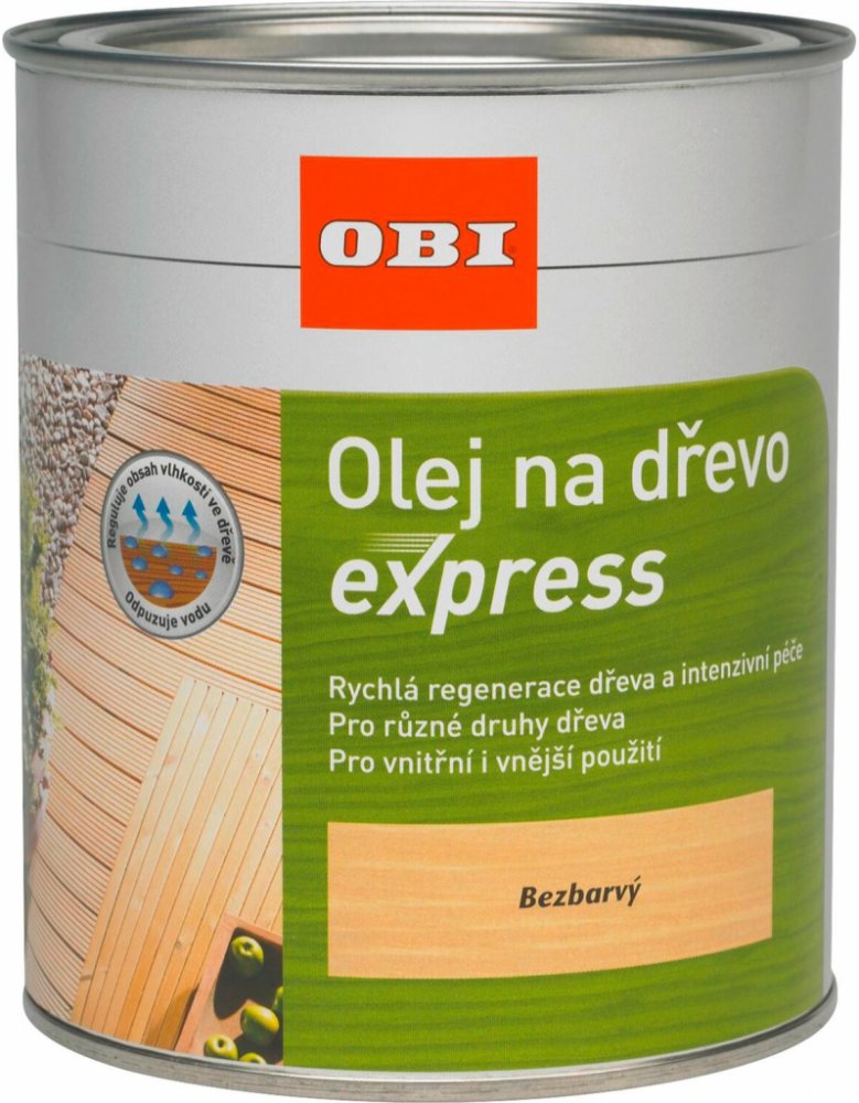 Olej na dřevo OBI Express OBI Express olej na dřevo je rychleschnoucí, přírodní speciální olej vhodný pro údržbu dřeva. Olej ideální pro první ošetření a údržbu dřevěného nábytku pro vnitřní i venkovní použití, použitelný pro všechny rozměrově nestálé druhy dřeva, jako například dřevěné obložení, ploty, pergoly, zástěny a další stavební díly z tvrdého i měkkého dřeva. Olej OBI Express je bez zápachu a snadno se s ním pracuje. Zdůrazňuje přirozenou kresbu dřeva, osvěžuje jeho vzhled a zvyšuje odolnost povrchu. V exteriéru chrání proti povětrnostním vlivům, zvyšuje vodoodpudivost, předchází vysoušení, praskání a šedivění.