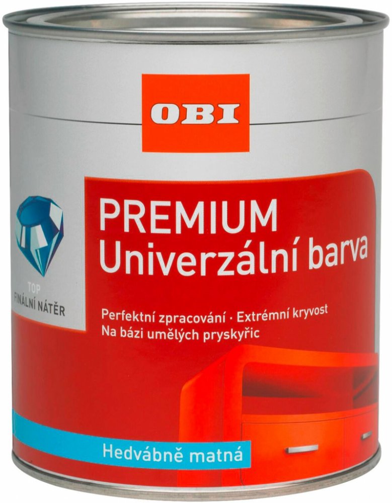 OBI Premium barevný lak obsahující rozpouštědlo je nearomatický, vysoce pevný lak na bázi syntetické pryskyřice s vynikajícími vlastnostmi při zpracování, velmi dobrou krycí schopností a vynikající roztíratelností, odolný proti popraskání, nárazu a poškrábání, má velmi dobrou odolnost proti povětrnostním vlivům a udržení lesku, je téměř bez zápachu a je velmi vydatný. Pro profesionální, vysoce kvalitní vrchní nátěry na všechny připravené povrchy opatřené základním nátěrem, na podklady z dřeva, kovu a přetíratelných plastů, nebo na nosných starých nátěrech pro vnitřní i venkovní použití. Obsah vystačí na cca 7,5 m2.