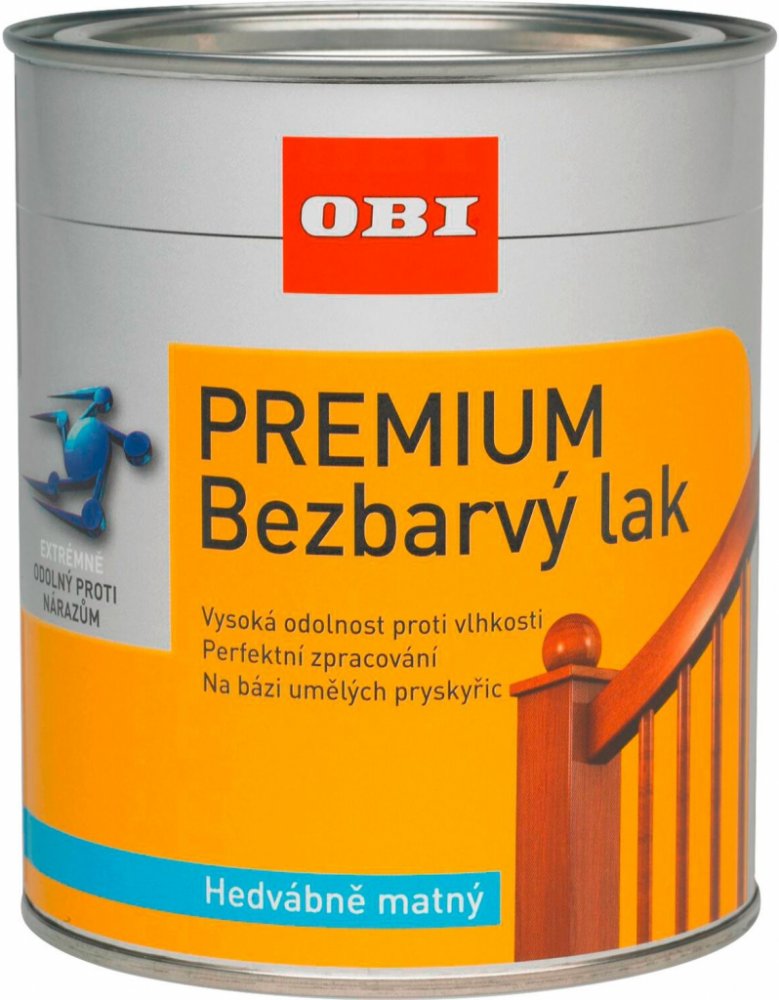 Vysoce kvalitní hedvábně matný bezbarvý lak na bázi umělé pryskyřice pro bezbarvé, odolné nátěry dřevěného nábytku, jako jsou např. stoly, židle atd., pro vnitřní i venkovní použití. OBI Premium bezbarvý lak neobsahuje aromáty, snadno se aplikuje, má velmi dobrou roztíratelnost a je odolný proti nárazům a úderům. Lze jej také použít na jiné dřevěné povrchy, jako např. dřevěné obložení, dveře, apod...