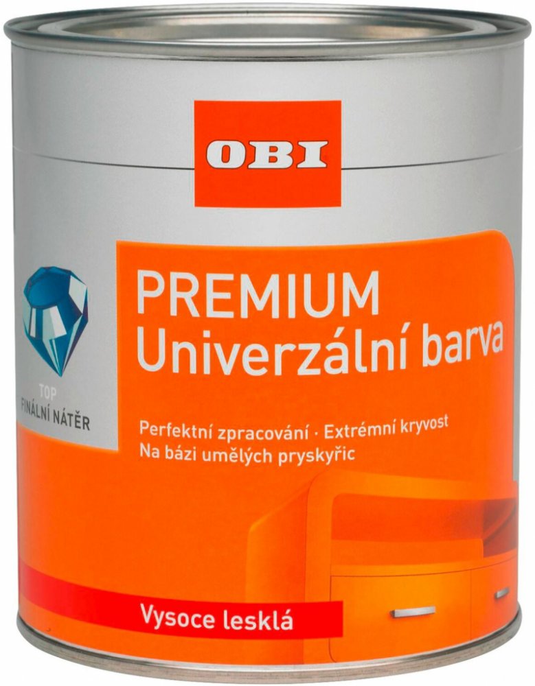 OBI Premium barevný lak obsahující rozpouštědlo je nearomatický, vysoce pevný lak na bázi syntetické pryskyřice s vynikajícími vlastnostmi při zpracování, velmi dobrou krycí schopností a vynikající roztíratelností, odolný proti popraskání, nárazu a poškrábání, má velmi dobrou odolnost proti povětrnostním vlivům a udržení lesku, je téměř bez zápachu a je velmi vydatný. Pro profesionální, vysoce kvalitní vrchní nátěry na všechny připravené povrchy opatřené základním nátěrem, na podklady z dřeva, kovu a přetíratelných plastů, nebo na nosných starých nátěrech pro vnitřní i venkovní použití. Obsah vystačí na cca 4 m2.