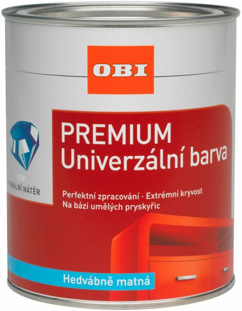 Univerzální barva OBI PREMIUM Univerzální barva OBI PREMIUM je vysoko pevnostní barva na bázi syntetické pryskyřice a rozpouštědel, s vysokým obsahem sušiny, bez aromatických látek, v kvalitě lodního laku s vynikajícími aplikačními vlastnostmi. Pro profesionální, vysoce kvalitní vrchní nátěry na všechny připravené, penetrované dřevěné, kovové a přetíratelné plastové povrchy, stejně jako na pevné stávající nátěry v interiéru, i exteriéru. Univerzální barva OBI PREMIUM je odolný proti nárazům, poškrábání, má vynikající rozliv, velmi dobrou kryvost a nadprůměrnou odolnost proti povětrnostním vlivům. Odolný také vůči běžným čisticím prostředkům v domácnosti. Univerzální barvy OBI PREMIUM jsou k dispozici v široké škále barev s vysoce lesklým nebo hedvábně matným povrchem. Aplikace barvy se provádí štětcem nebo válečkem v alespoň 2 vrstvách. Při 20 °C a 65% relativní vlhkosti je povrch suchý za cca 6-8 hodin a přetíratelný po cca 24 hodinách.