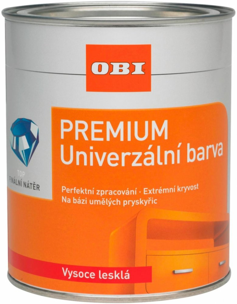 Univerzální barva OBI PREMIUM Univerzální barva OBI PREMIUM je vysoko pevnostní barva na bázi syntetické pryskyřice a rozpouštědel, s vysokým obsahem sušiny, bez aromatických látek, v kvalitě lodního laku s vynikajícími aplikačními vlastnostmi. Pro profesionální, vysoce kvalitní vrchní nátěry na všechny připravené, penetrované dřevěné, kovové a přetíratelné plastové povrchy, stejně jako na pevné stávající nátěry v interiéru, i exteriéru. Univerzální barva OBI PREMIUM je odolný proti nárazům, poškrábání, má vynikající rozliv, velmi dobrou kryvost a nadprůměrnou odolnost proti povětrnostním vlivům. Odolný také vůči běžným čisticím prostředkům v domácnosti. Univerzální barvy OBI PREMIUM jsou k dispozici v široké škále barev s vysoce lesklým nebo hedvábně matným povrchem. Aplikace barvy se provádí štětcem nebo válečkem v alespoň 2 vrstvách. Při 20 °C a 65% relativní vlhkosti je povrch suchý za cca 6-8 hodin a přetíratelný po cca 24 hodinách.