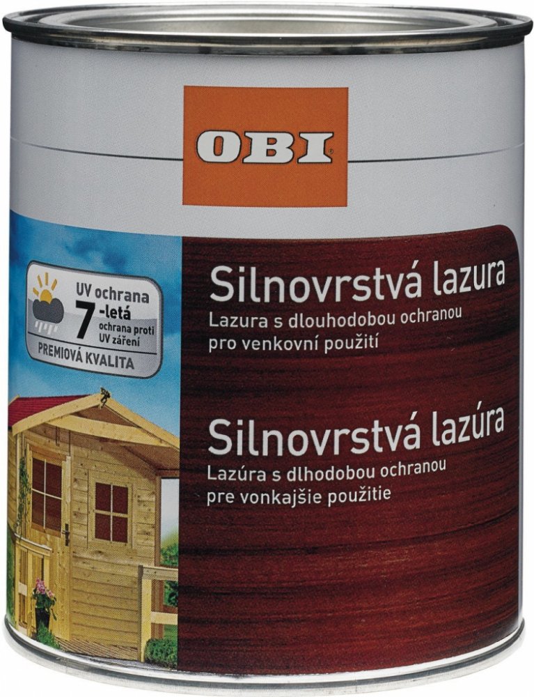 OBI Silnovrstvá lazura s dlouhodobou ochranou pro venkovní použití Tato prémiová OBI silnovrstvá lazura je dostupná v mnoha odstínech dřeva. Je vhodná pro všechny rozměrově stálé i nestálé dřevěné prvky ve venkovním prostoru, jako jsou např. vnější povrchy dřevěných domků, oken, dveří, fasádní obklady, okenice a další. Lazura je odolná vůči povětrnostním vlivům, chrání před UV zářením - až 7letá ochrana, bez aromatických látek pro venkovní použití, vhodná pro všechna tuzemská i zahraniční, listnatá i jehličnatá dřeva. Je také difuzní, tixotropní, nekape, lze ji nanášet rovnoměrně bez šmouh a zdůrazňuje přirozenou kresbu dřeva. Snadné nanášení štětcem. Ideální počet vrstev 1-3. Spotřeba cca 95 ml/m2. Povrch je suchý po cca 4 hodinách, přetíratelný po cca 24 hodinách. Při nižších teplotách nebo vyšší vlhkosti se doba usychání může lišit. Nářadí po použití očistěte vodou, v případě potřeby s přídavkem saponátu.