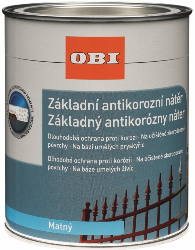 Základní antikorozní nátěr OBI OBI základní antikorozní nátěr je univerzální nátěr vhodný na očištěné zkorodované povrchy na bázi umělých pryskyřic a aktivními antikorozními pigmenty. Dlouhodobě chrání proti korozi. Ideální na hliník, měď a zinek.