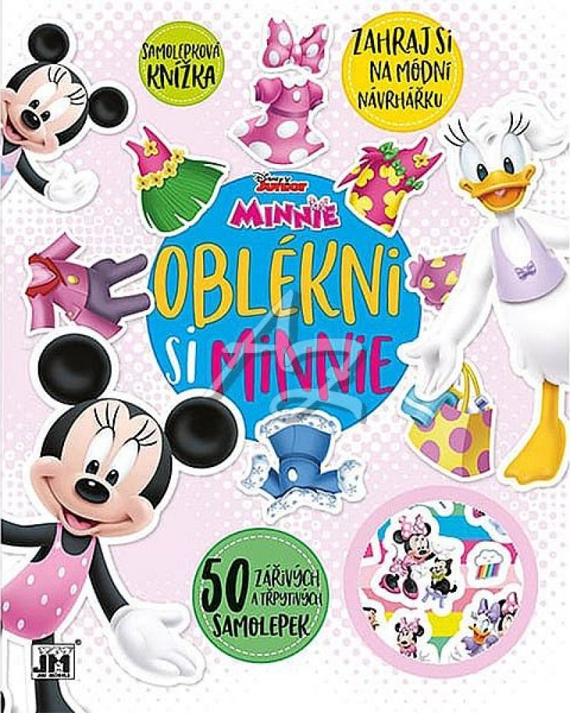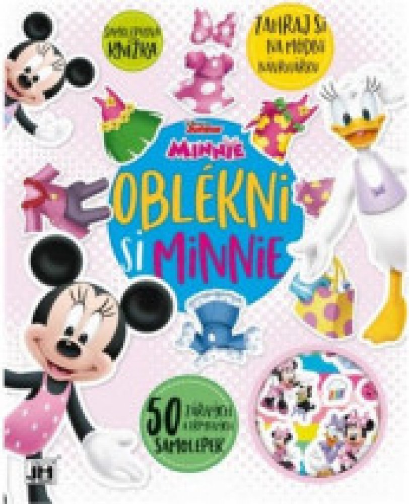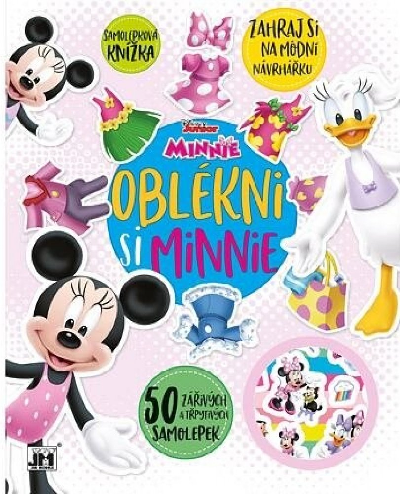 Samolepková knížka. Zahraj si na módní návrhářku. Kniha obsahuje 24 stran zábavných aktivit a 8 listů samolepek (z nichž je 50 třpytivých) k dolepení a ozdobení, s motivy myšky Minnie a jejich kamarádů.