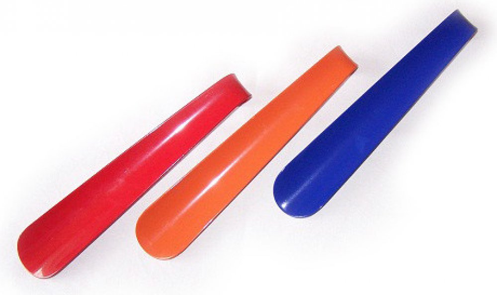 Malá kovová obouvací lžíce, barevná. Celková délka 23 cm.