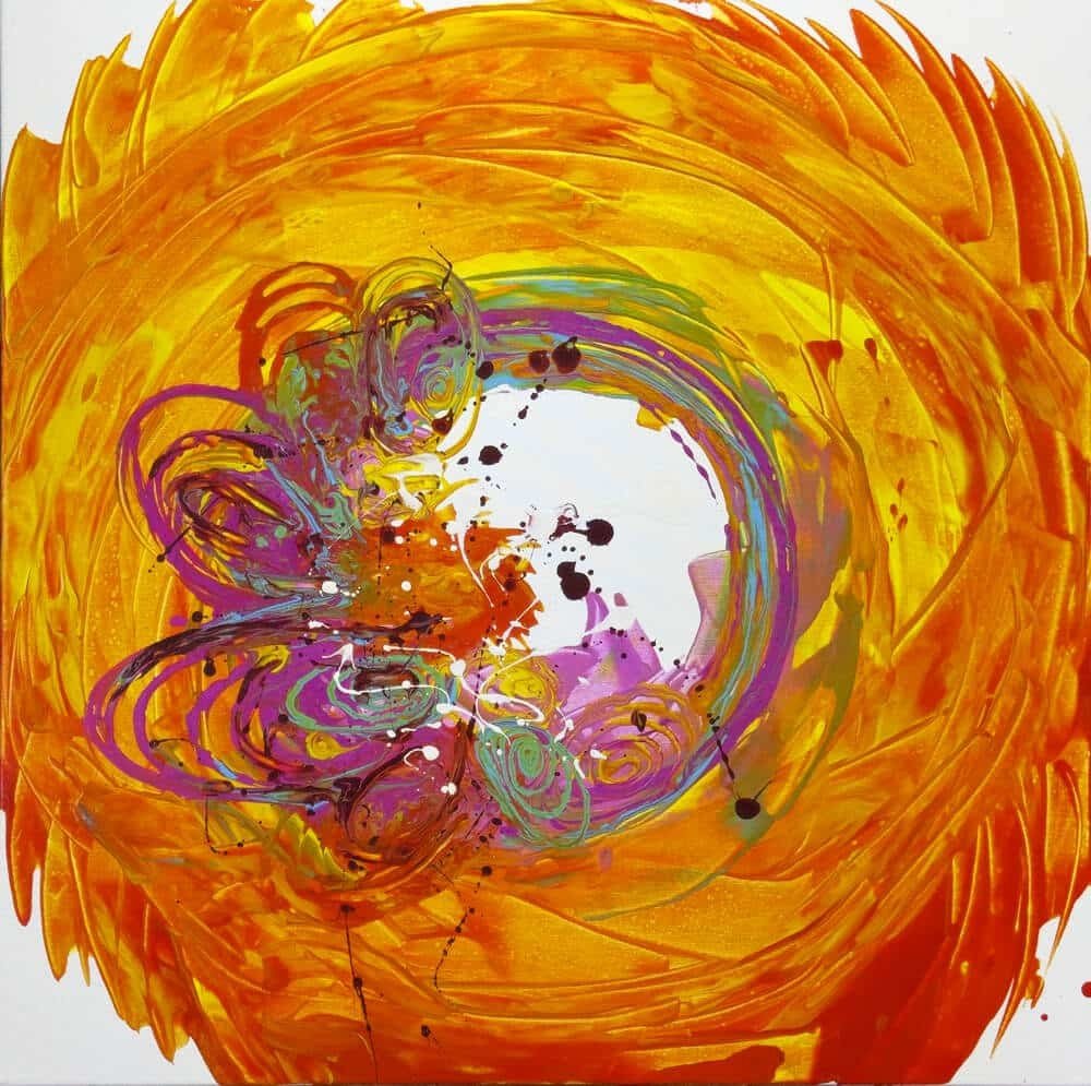 Prodej abstraktně malovaného obrazu na plátně. V obraze Hřejivý úsměv se setkáváme s obrazem, který přináší radost a teplé pocity. Dominujícím prvkem je kolo oranžovo-žluté barvy, jasně připomínající sluneční paprsky. Uprostřed tohoto slunce se nacházejí jemné odstíny růžové, zelené, tyrkysové a bílé, vytvářející dojem barevných koleček či kruhů. Tyto abstraktní prvky dodávají obrazu dynamiku a en...