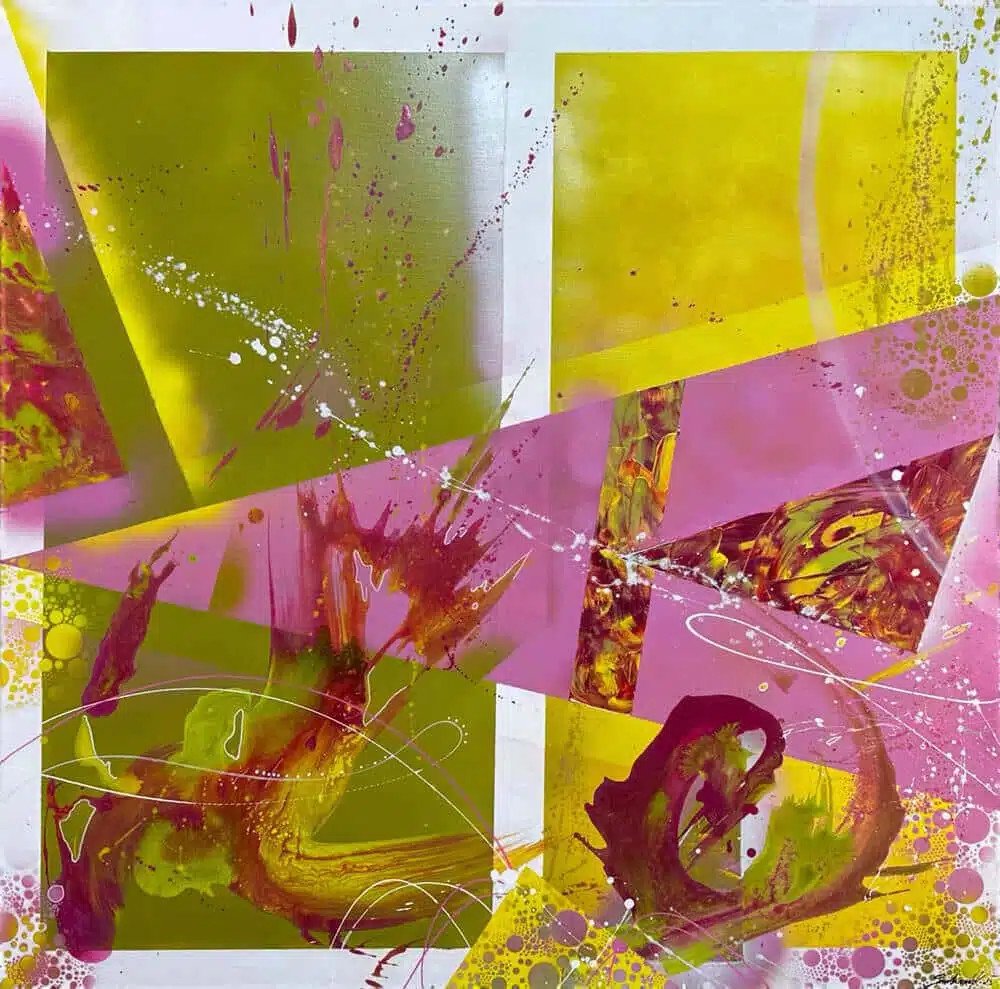 Prodej abstraktně malovaného obrazu na plátně. Barvy přináší veselou paletu zelené, růžové a žluté do abstraktního obrazu. Tyto odvážné a živé barvy spolu tvoří zářivý výjev, který připomíná radostné a dynamické momenty, plné světla a života. Jedná se o abstraktní obraz na plátně malovaný akrylovými barvami.