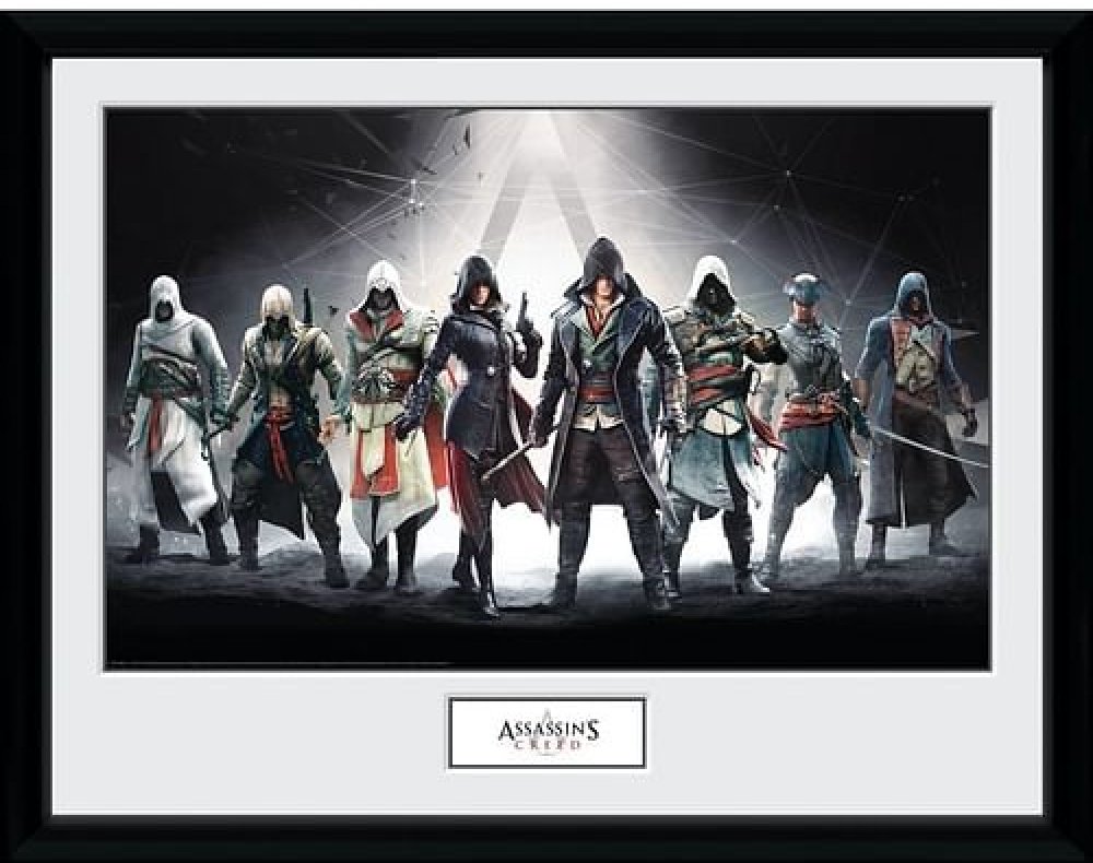 Zarámovaný obraz na stěnu s hrdiny herní série Assassin s Creed: Altair, Ezio Auditore, Evie a Jacob Fry a další.