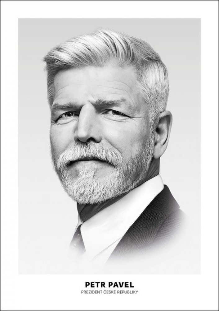 Černobílý obraz prezidenta ČR Petra Pavla rozměru 420 x 594 mm, vytištěn na kvalitním křídovém papíru vysoké gramáže 255 g/m2.